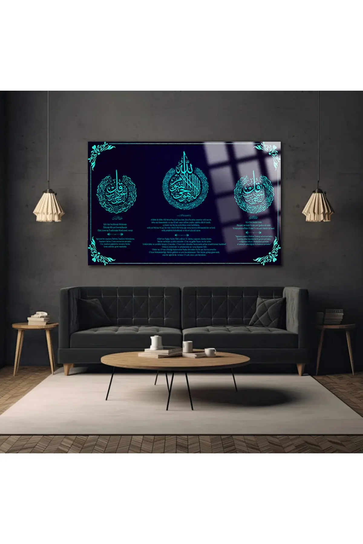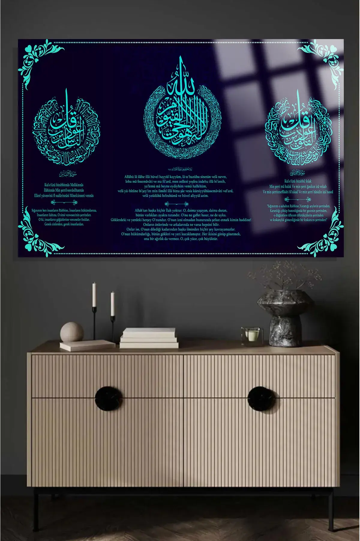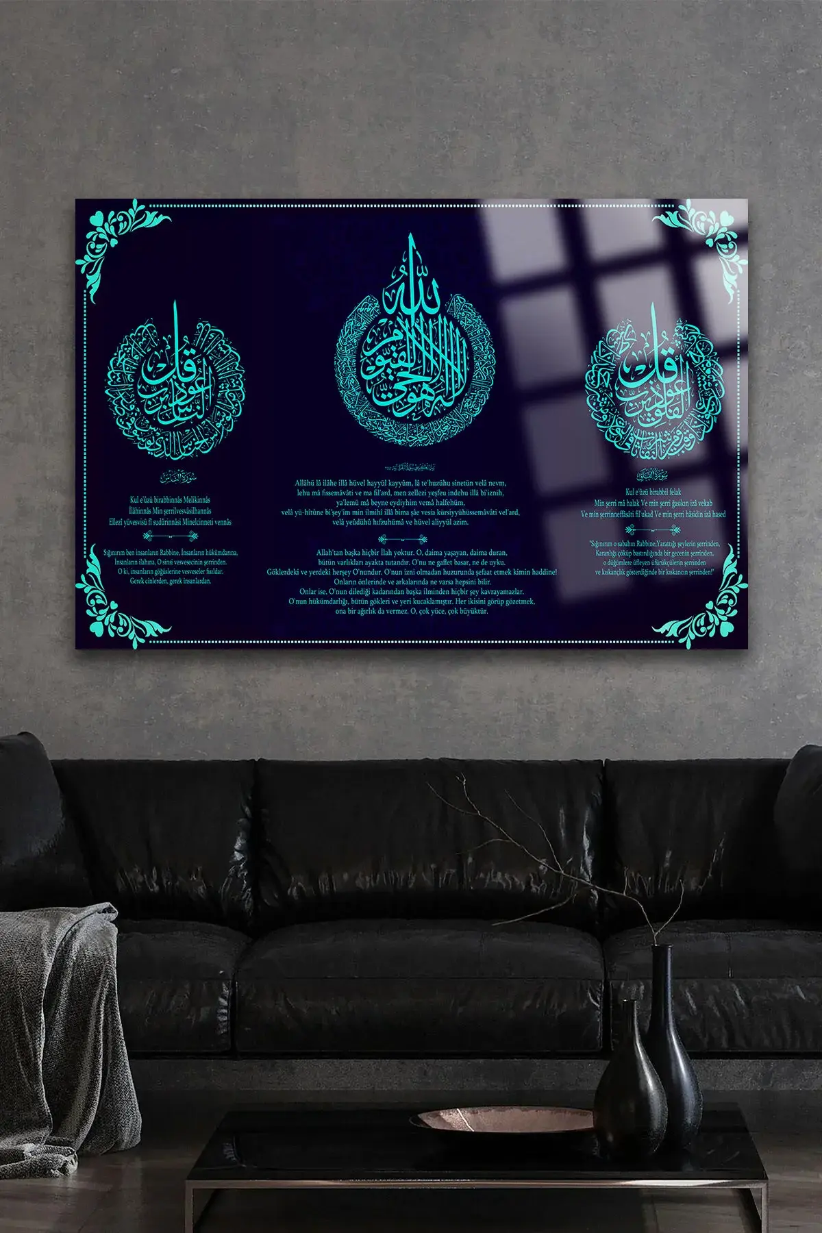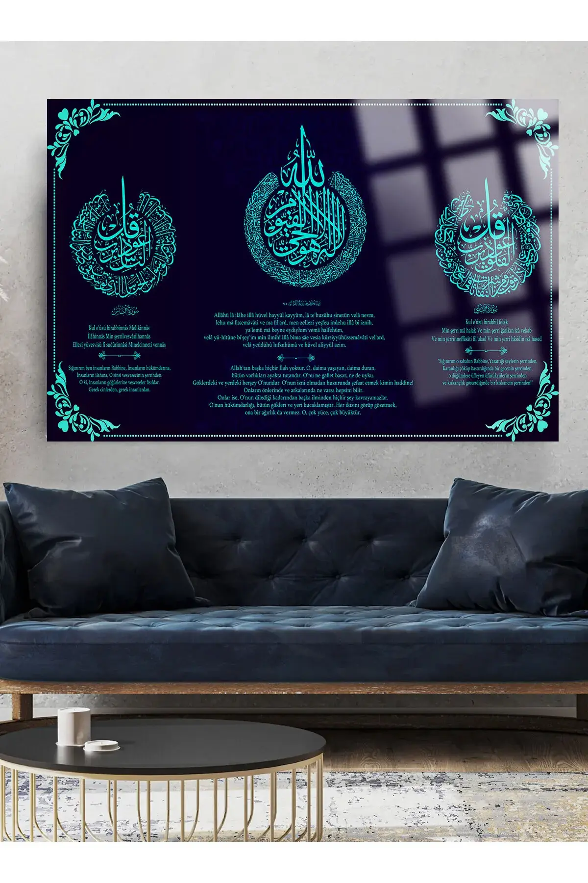 Ayetel Kürsi,Felak ve Nas Sureleri Hem Okunuşu Hem Meali Dini İslami, Hediyelik Büyük Cam Tablo Lacivert