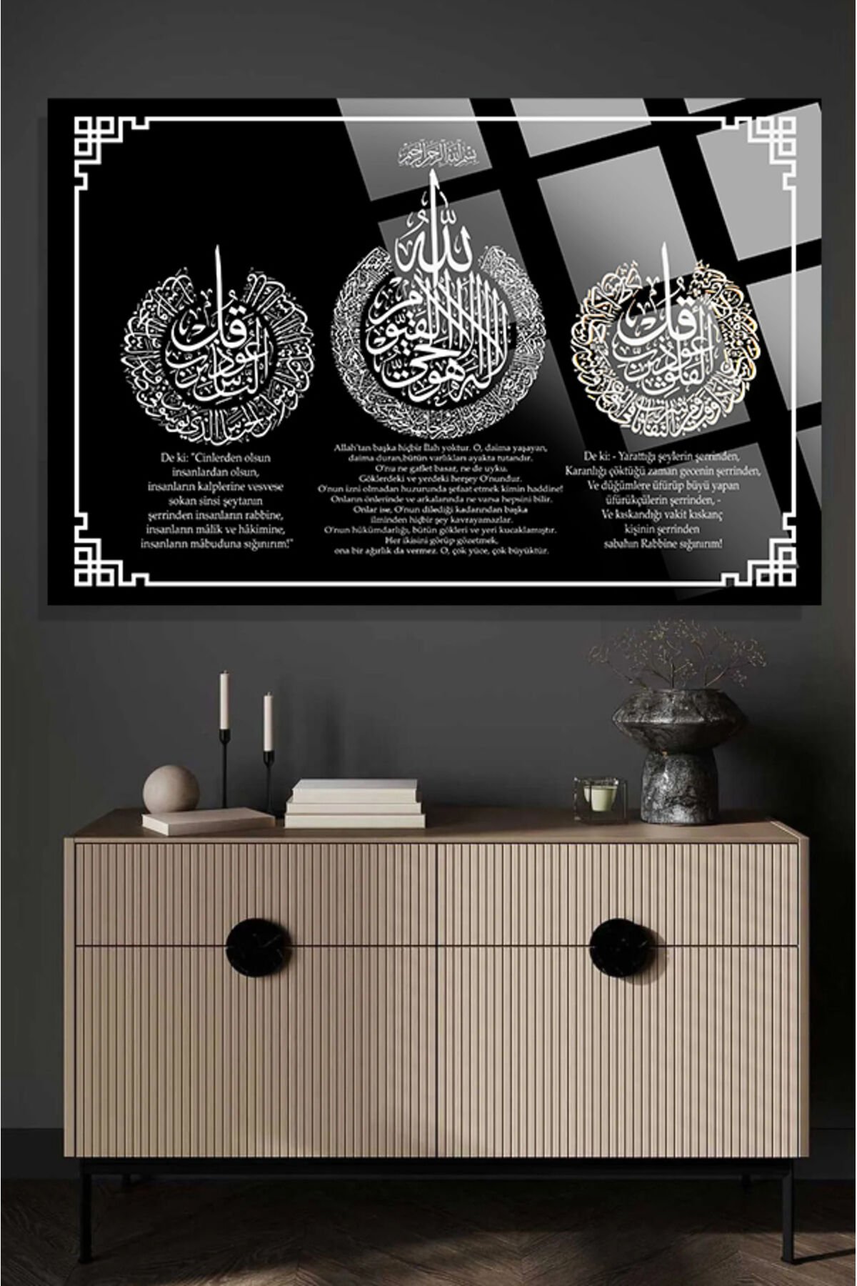 Ayetel Kürsi, Nas ve Felak Sureleri 4mm Lüks Kırılmaz Temperli Yüksek Çözünürlüklü Cam Tablo siyah 2