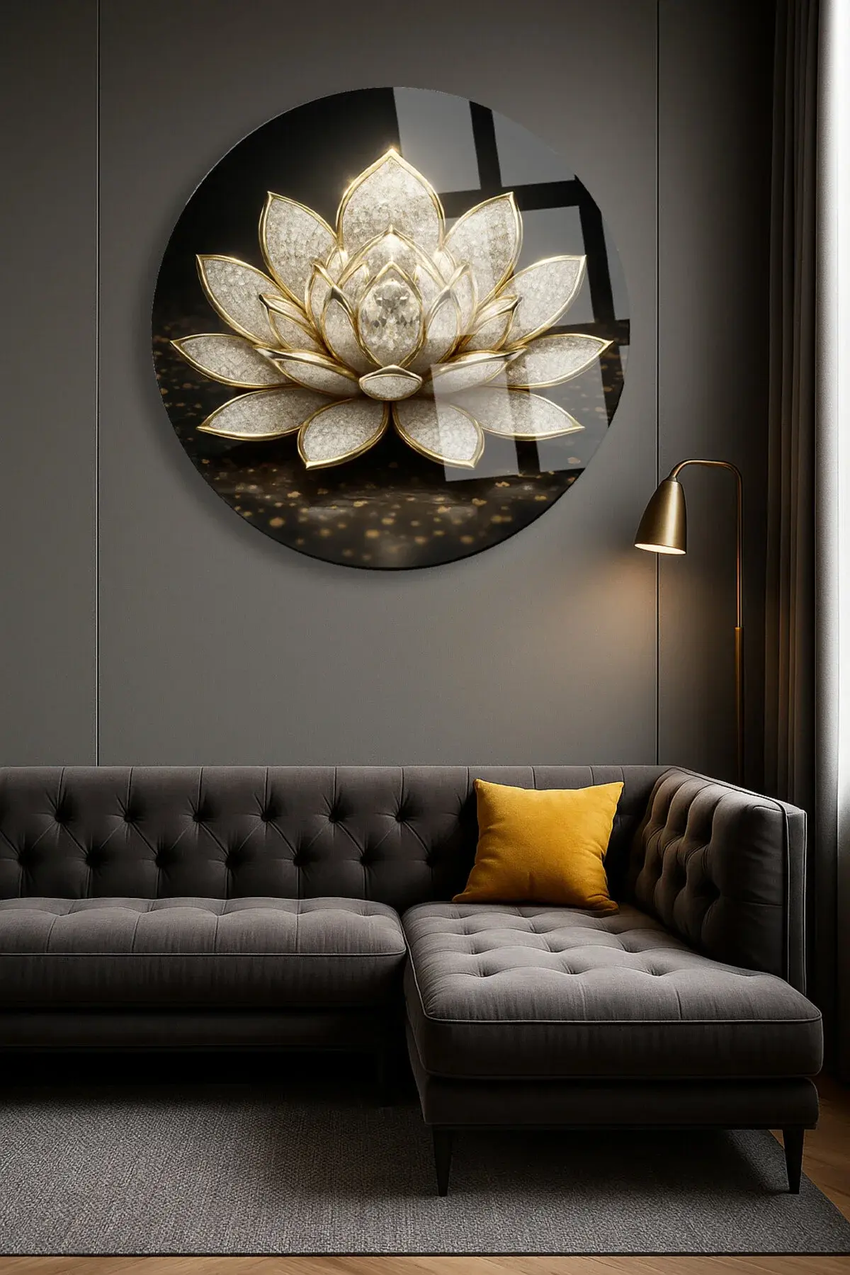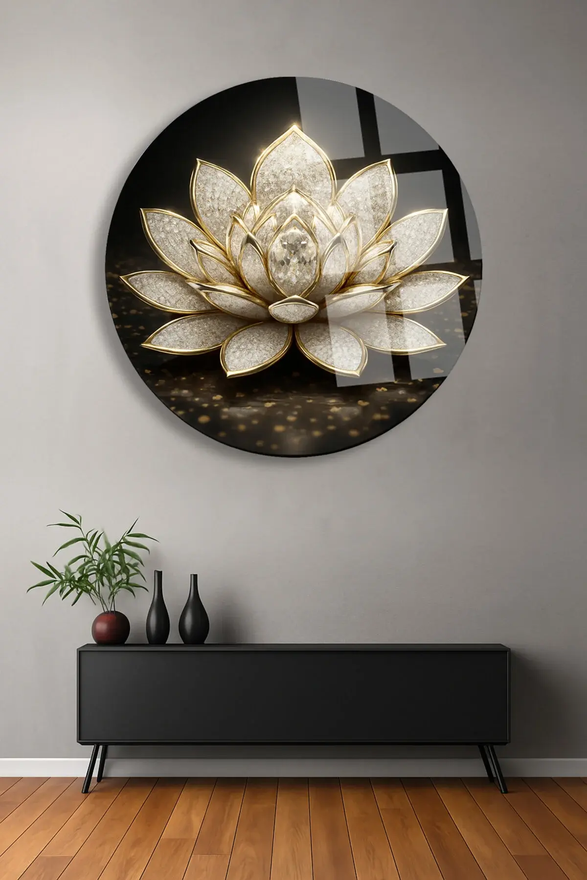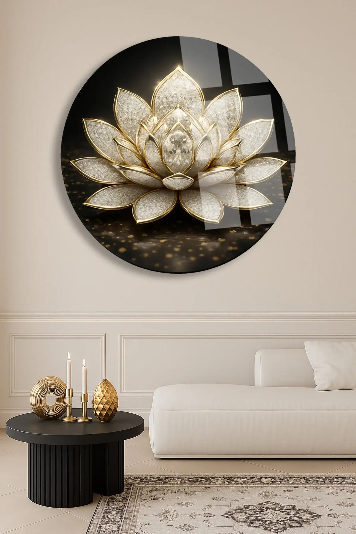 BEYAZ ALTIN LOTUS ÇİÇEĞİ ULRTA CANLI RENKLER KIRILMAZ LÜKS MODERN YUVARLAK CAM TABLO EV HEDİYESİ