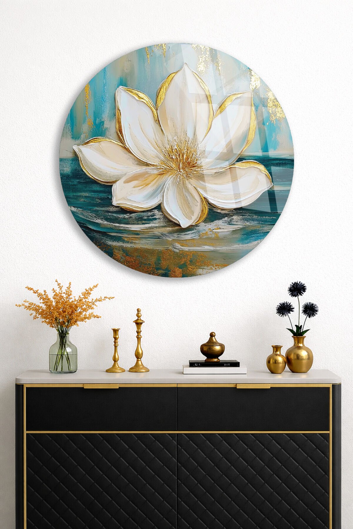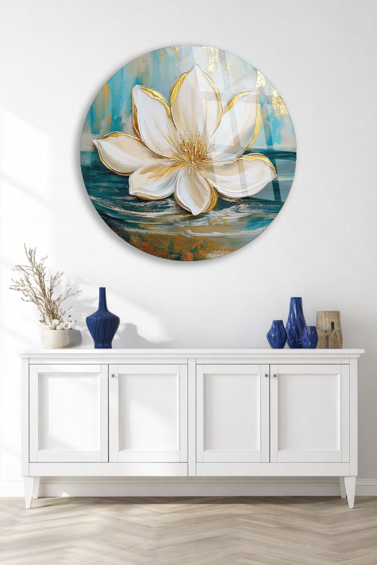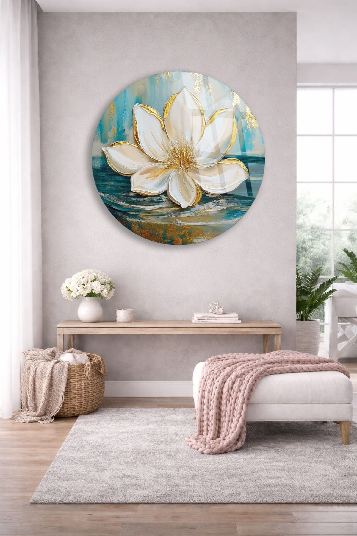 Beyaz Lotus Cam Tablo – Sakinlik ve Zarafet Temalı Dekor Turkuaz