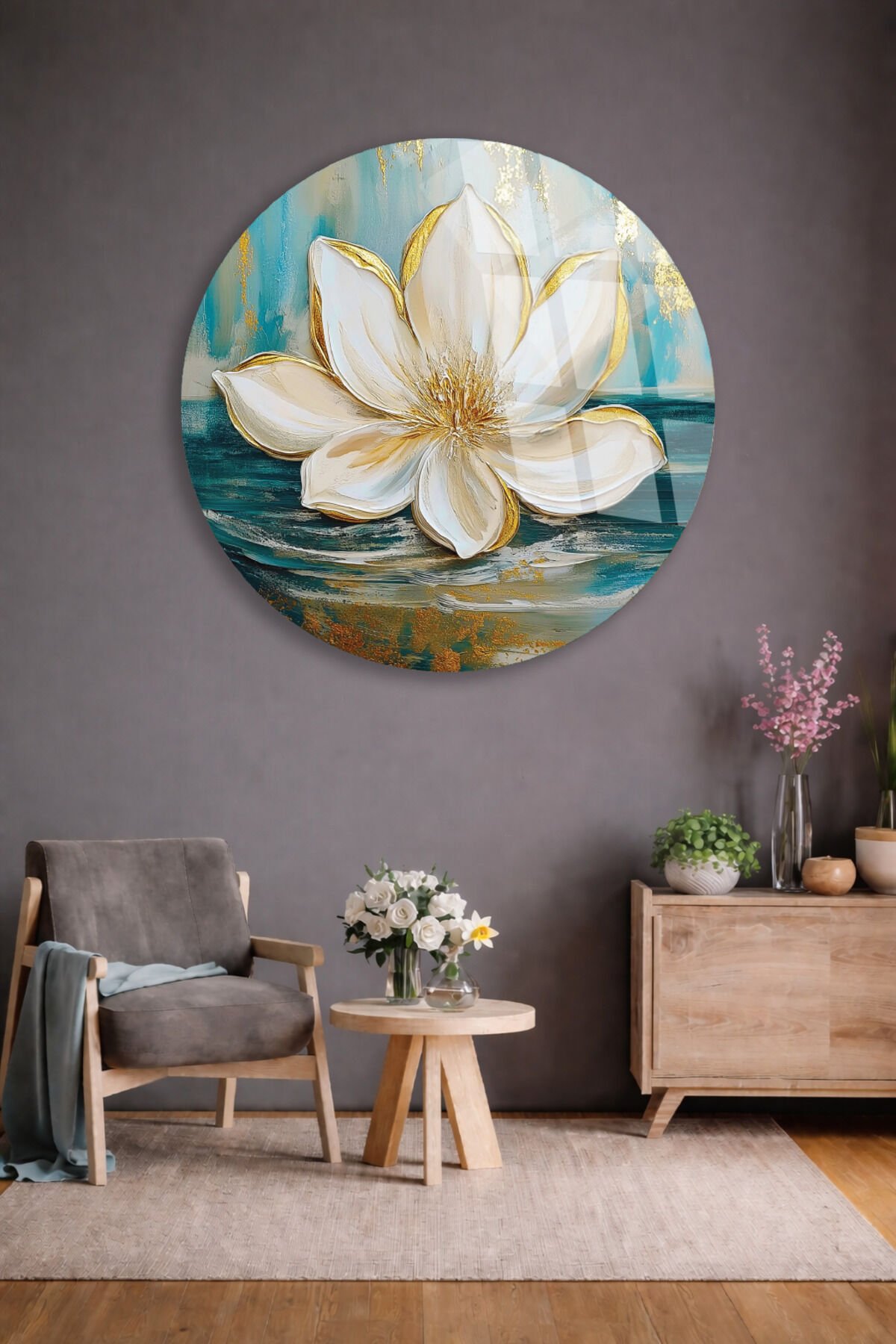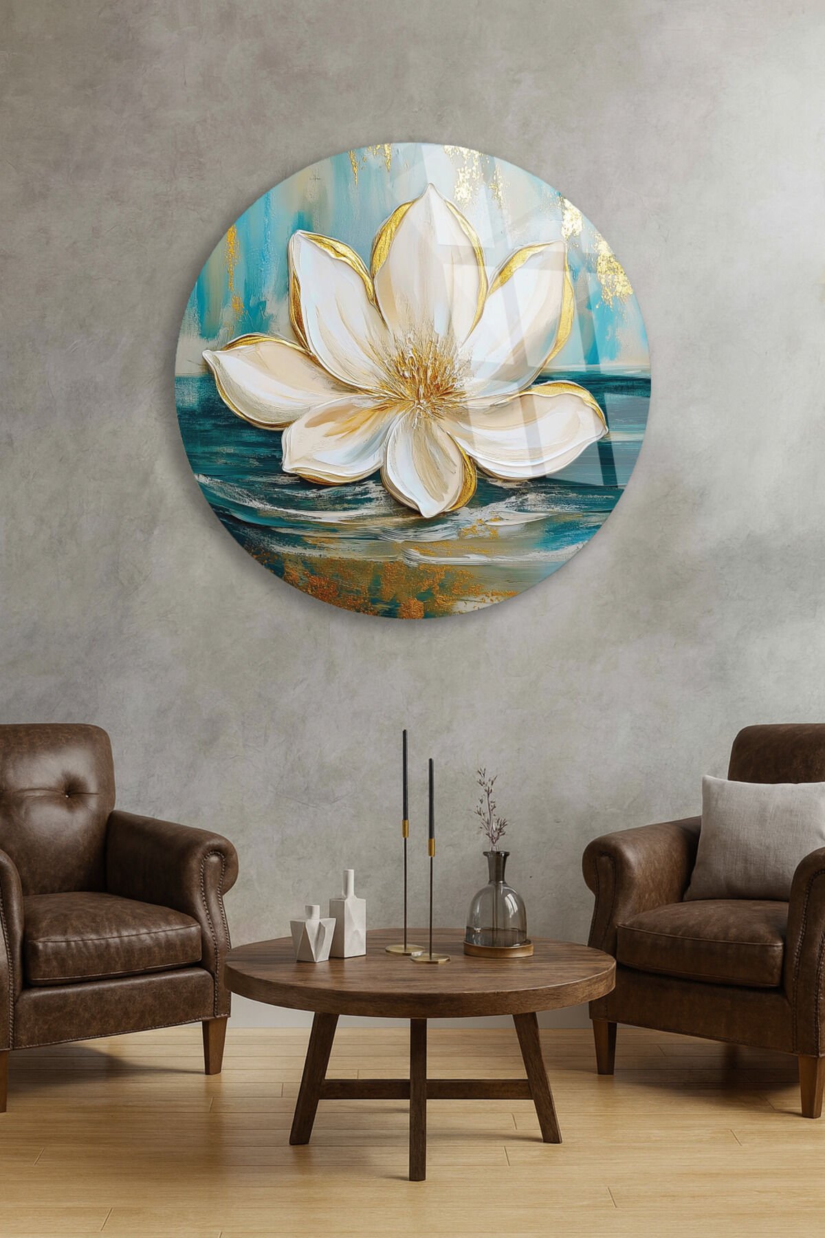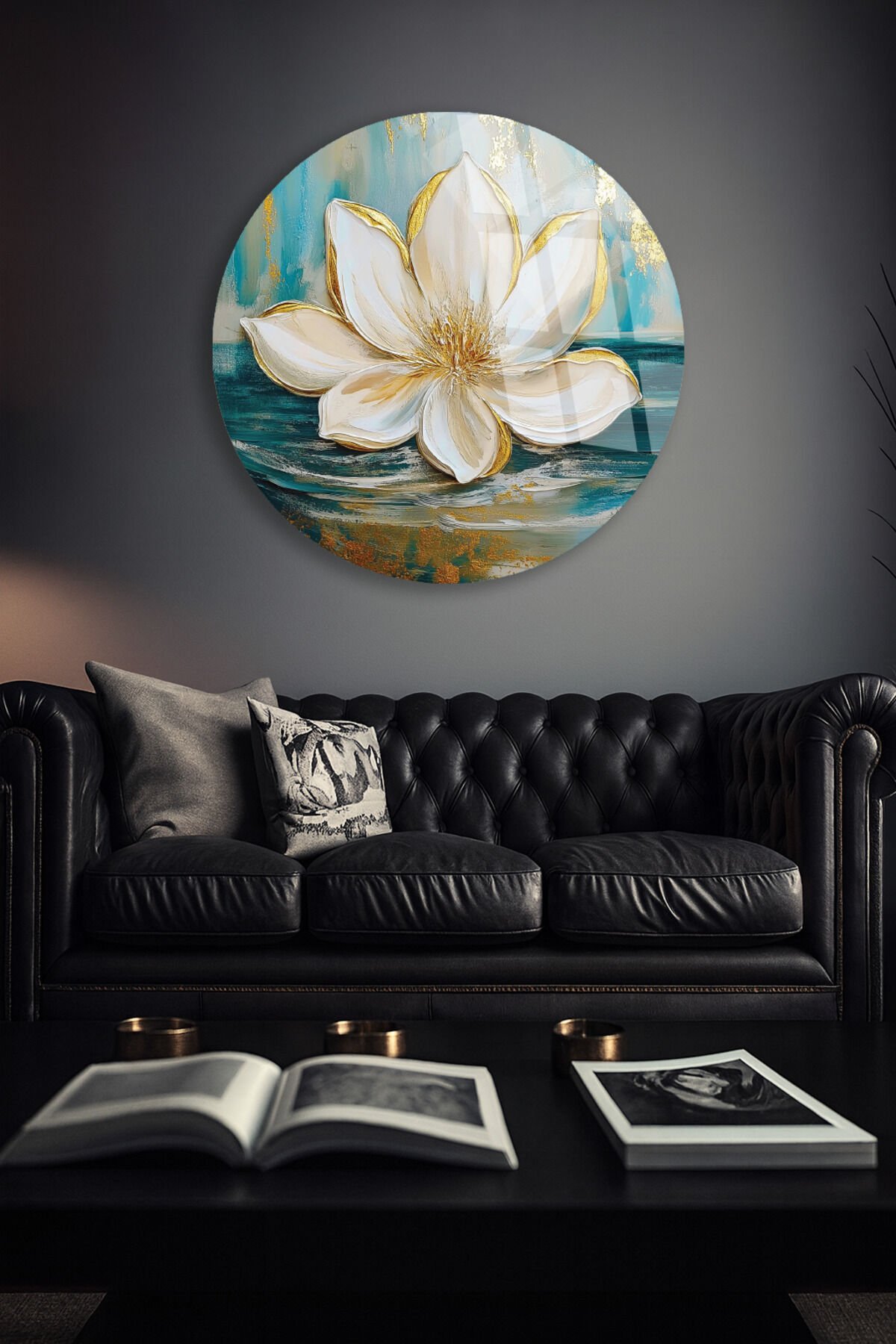 Beyaz Lotus Cam Tablo – Sakinlik ve Zarafet Temalı Dekor Turkuaz