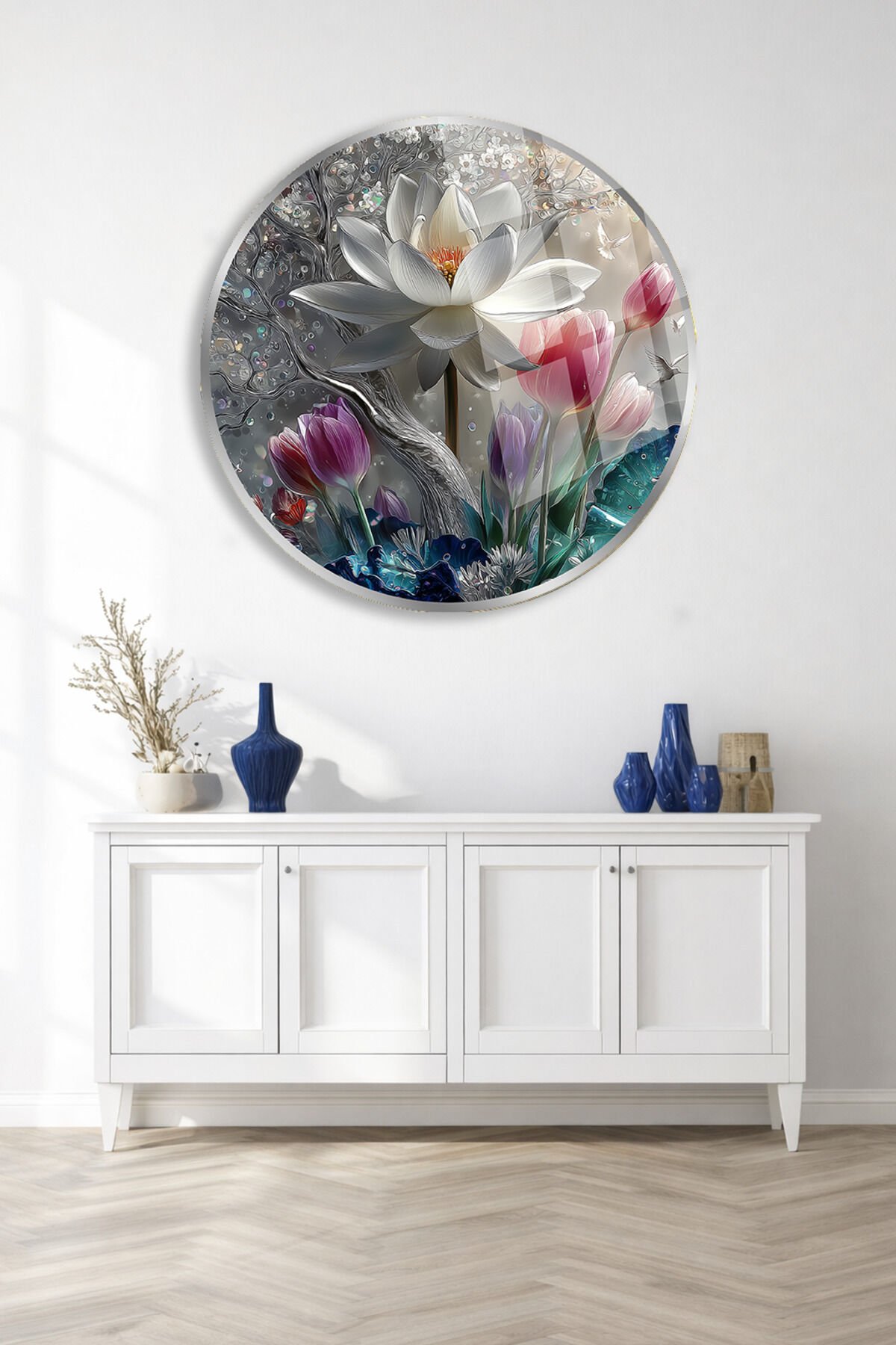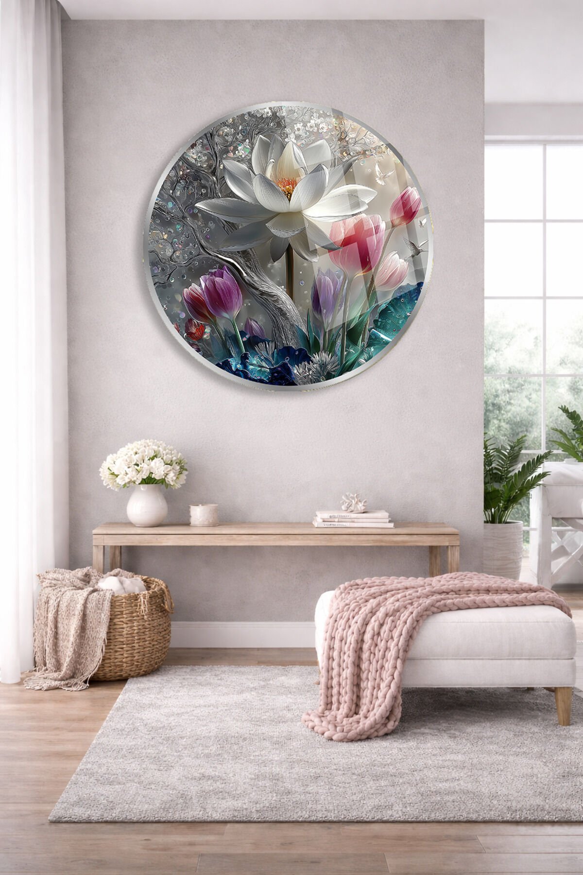 BEYAZ LOTUS YUVARLAK MODERN TABLO KIRILMAZ CAM DUVAR TABLOSU ULTRA CANLI RENKLER EV OFİS HEDİYESİ Krem