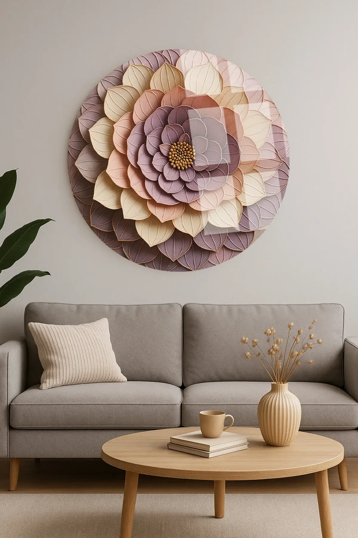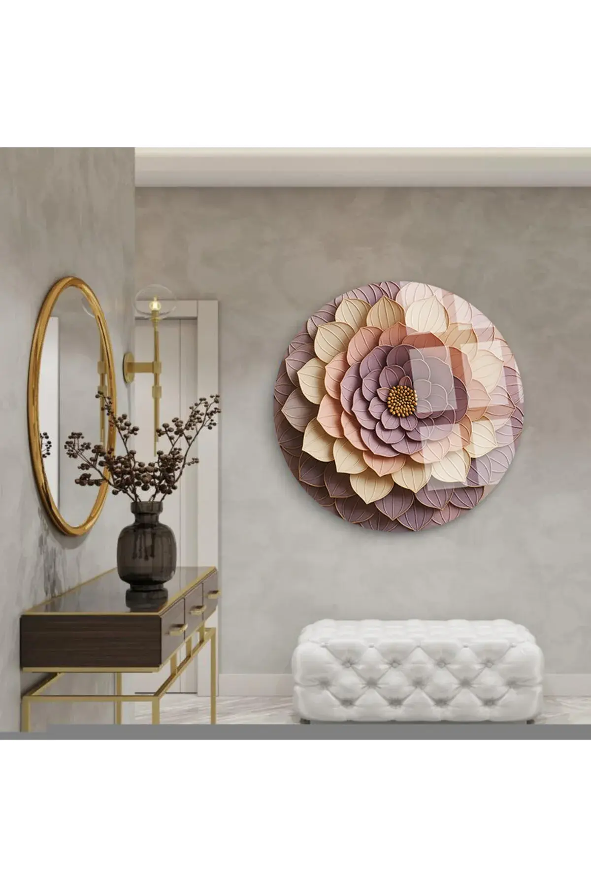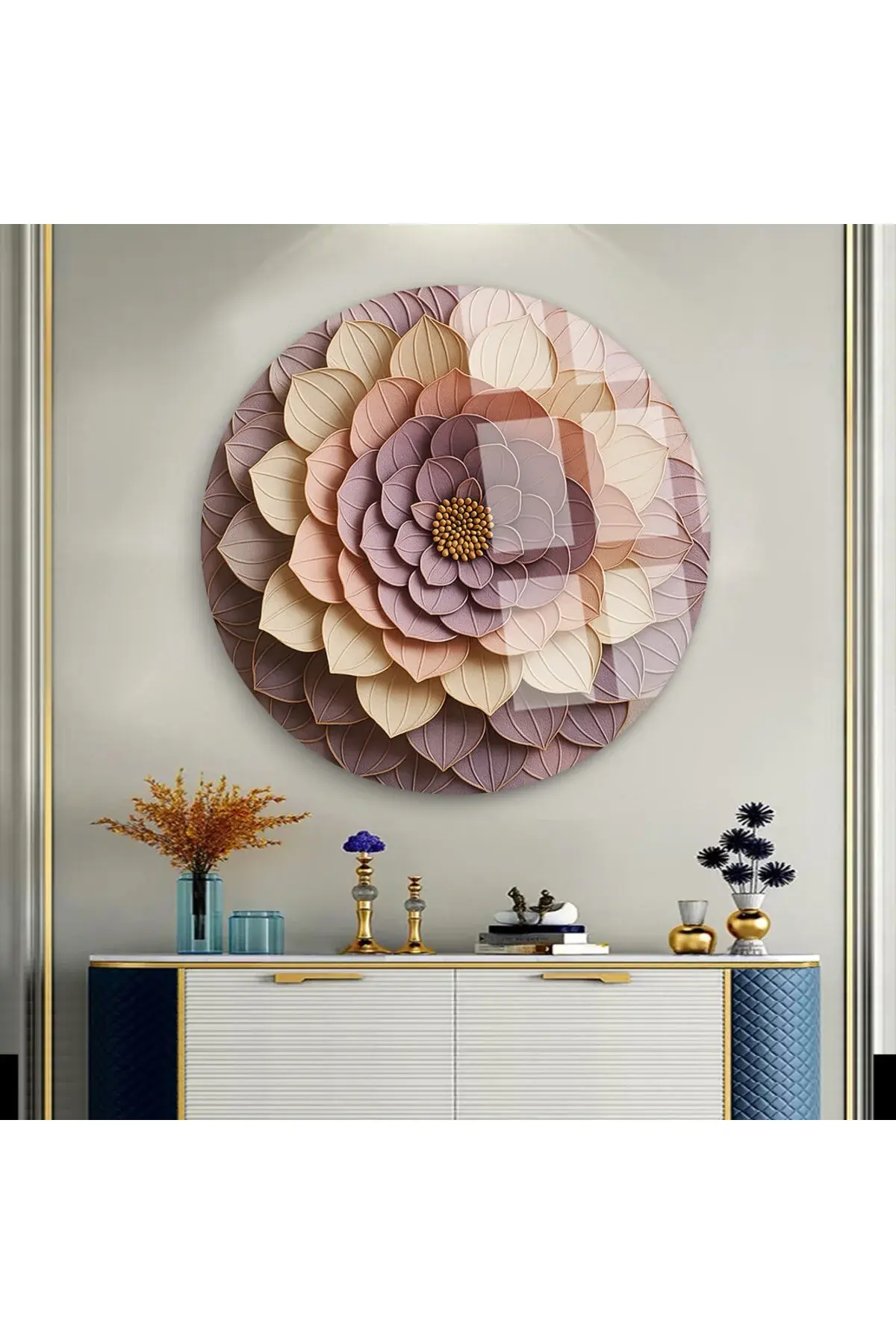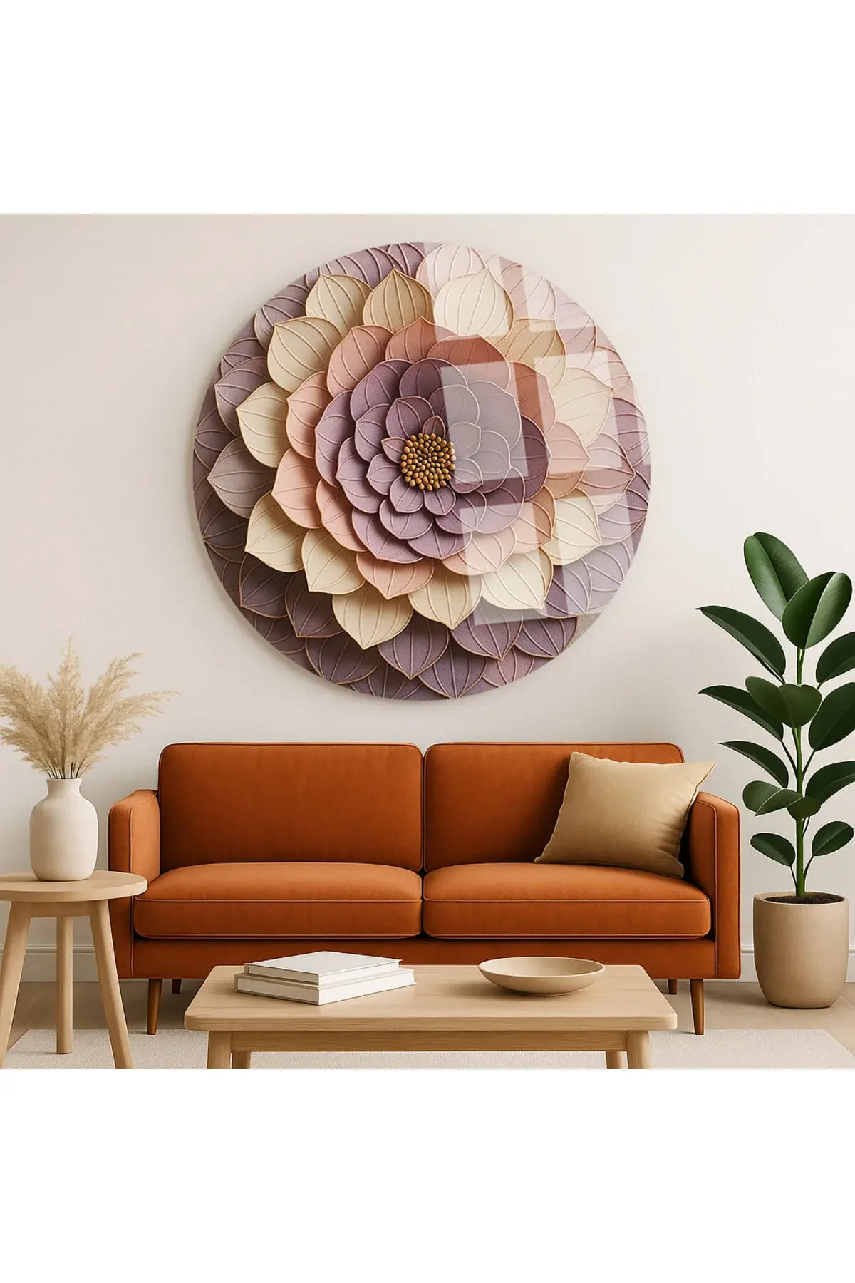 ÇİÇEĞİN İÇİ TASARIMI KIRILMAZ YUVARLAK CAM TABLO LÜKS EV HEDİYESİ ULTRA CANLI RENKLİ Mor