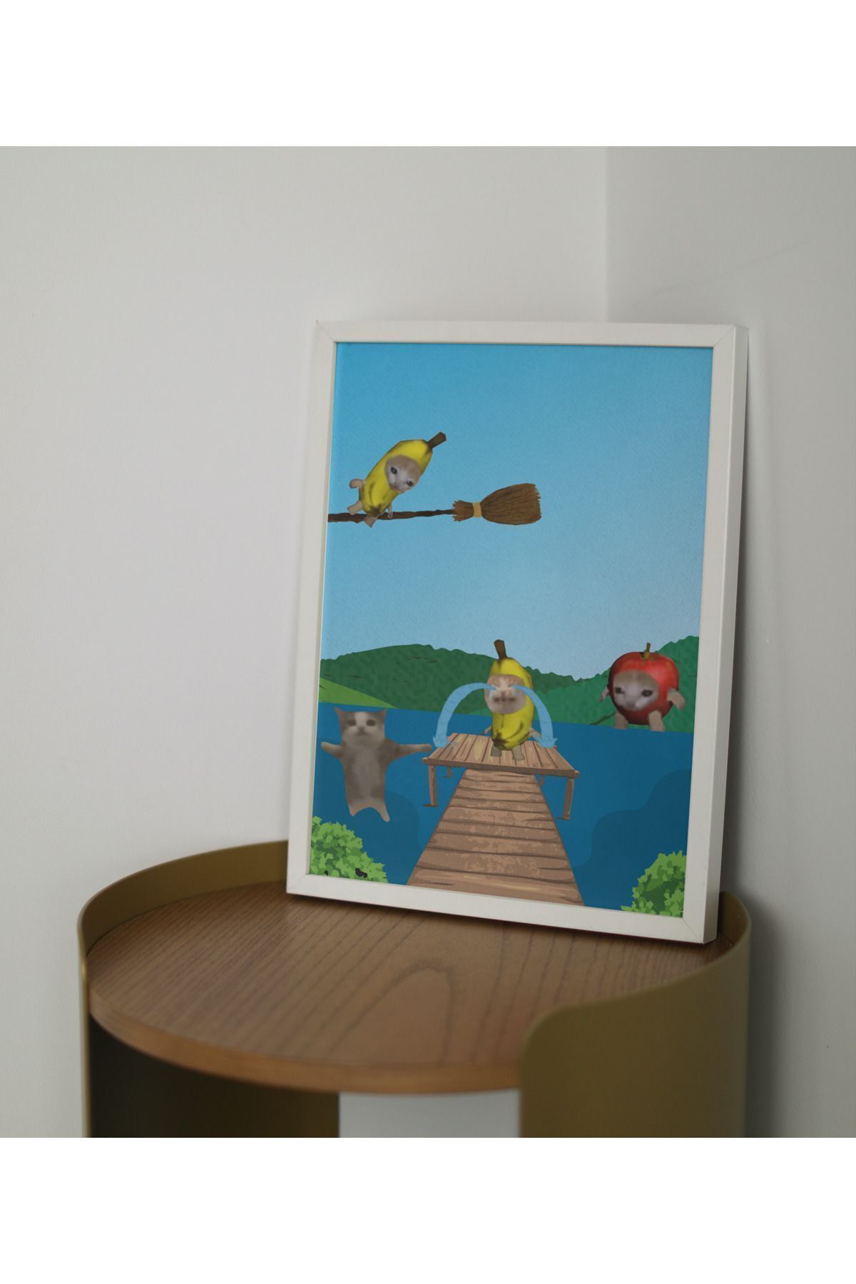 Çok Renkli - Happy Happy Cat Banana Cat Dekorasyon Çerçeveli Tasarım Poster Tablo PSTR-1133