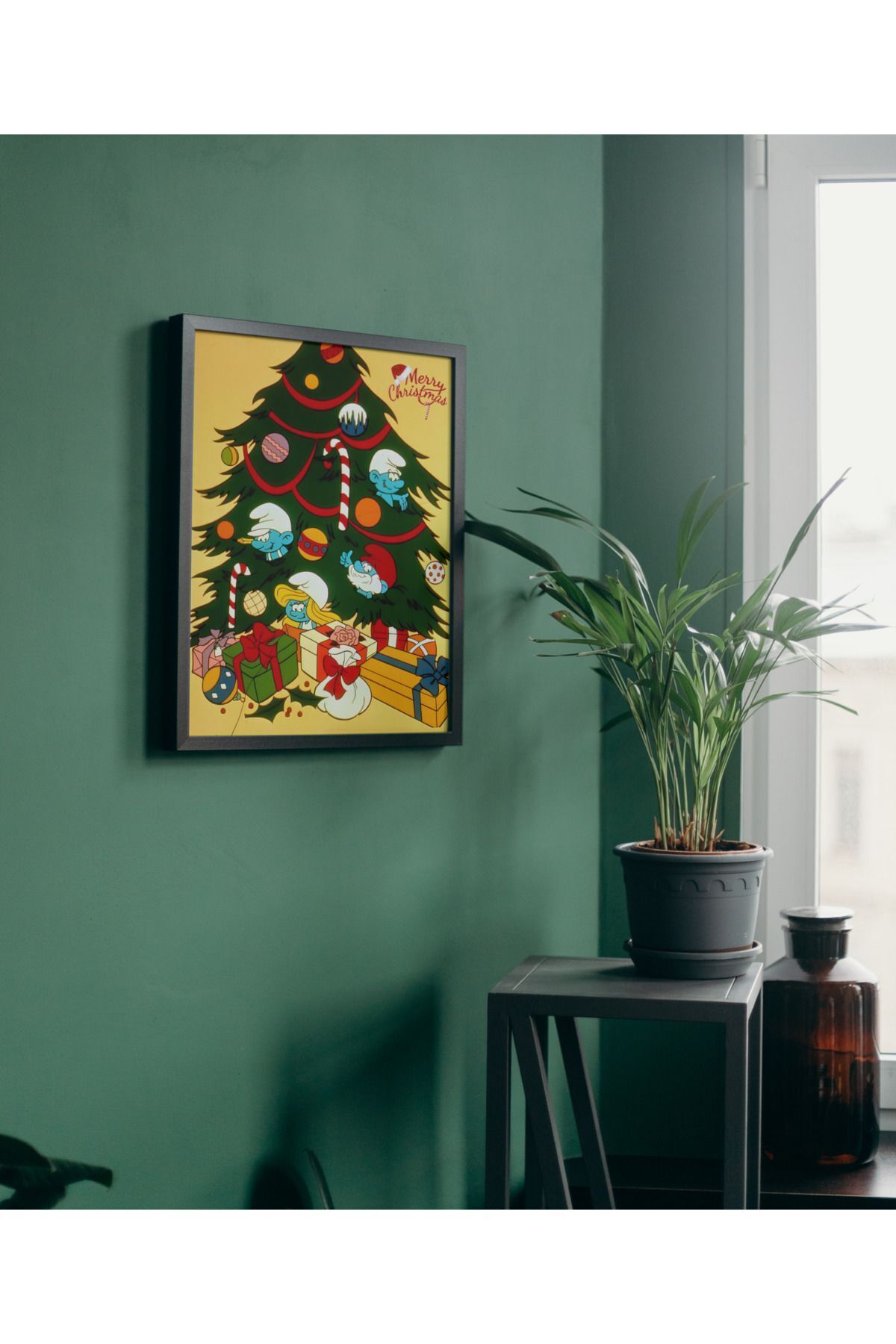 Çok Renkli - Şirin Baba Yılbaşı Ağacı Noel Christmas Poster Çerçeveli Hediyelik Dekorasyon Tasarım Tablo