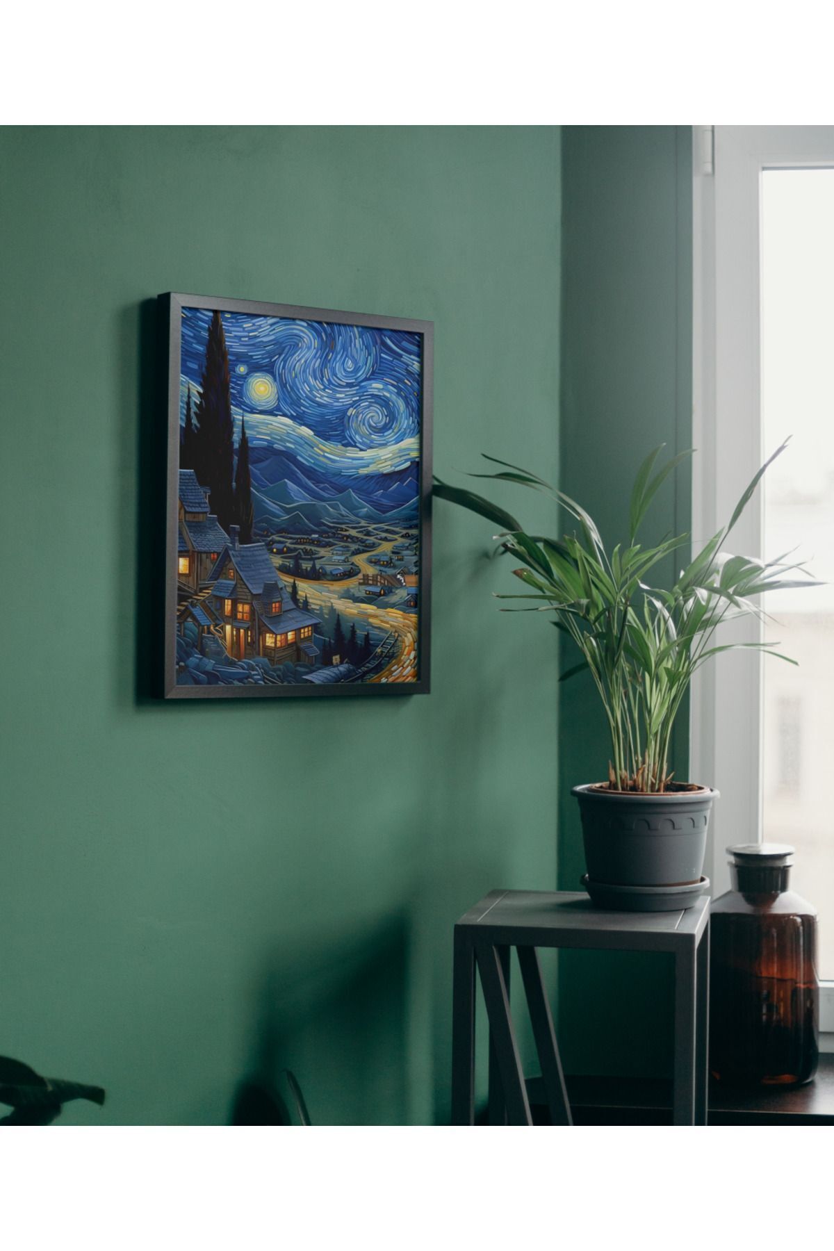 Çok Renkli - Van Gogh Ve Yıldızlı Geceler Kasabası Poster Çerçeveli Yüksek Kaliteli Dekorasyon Tasarım Tablo