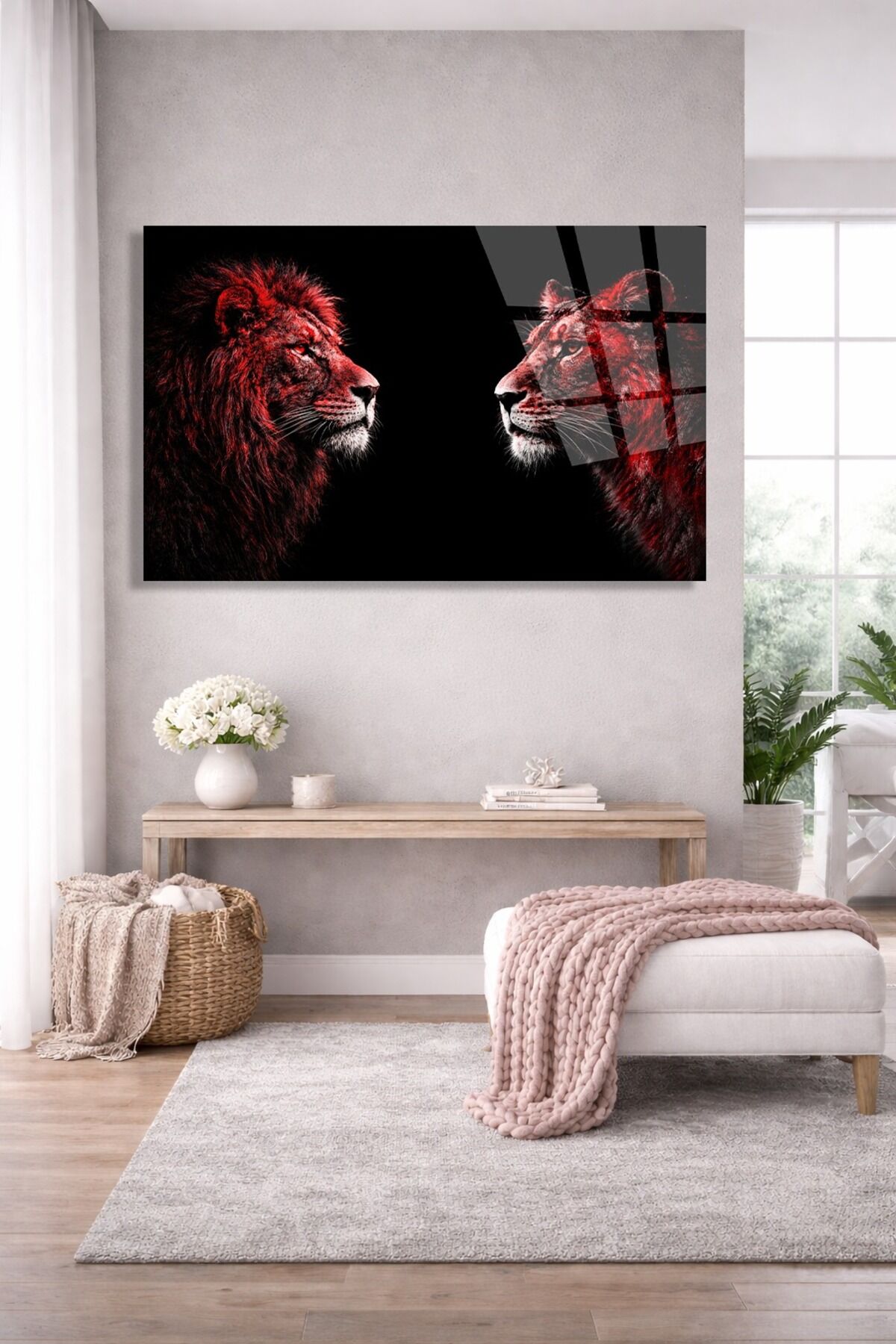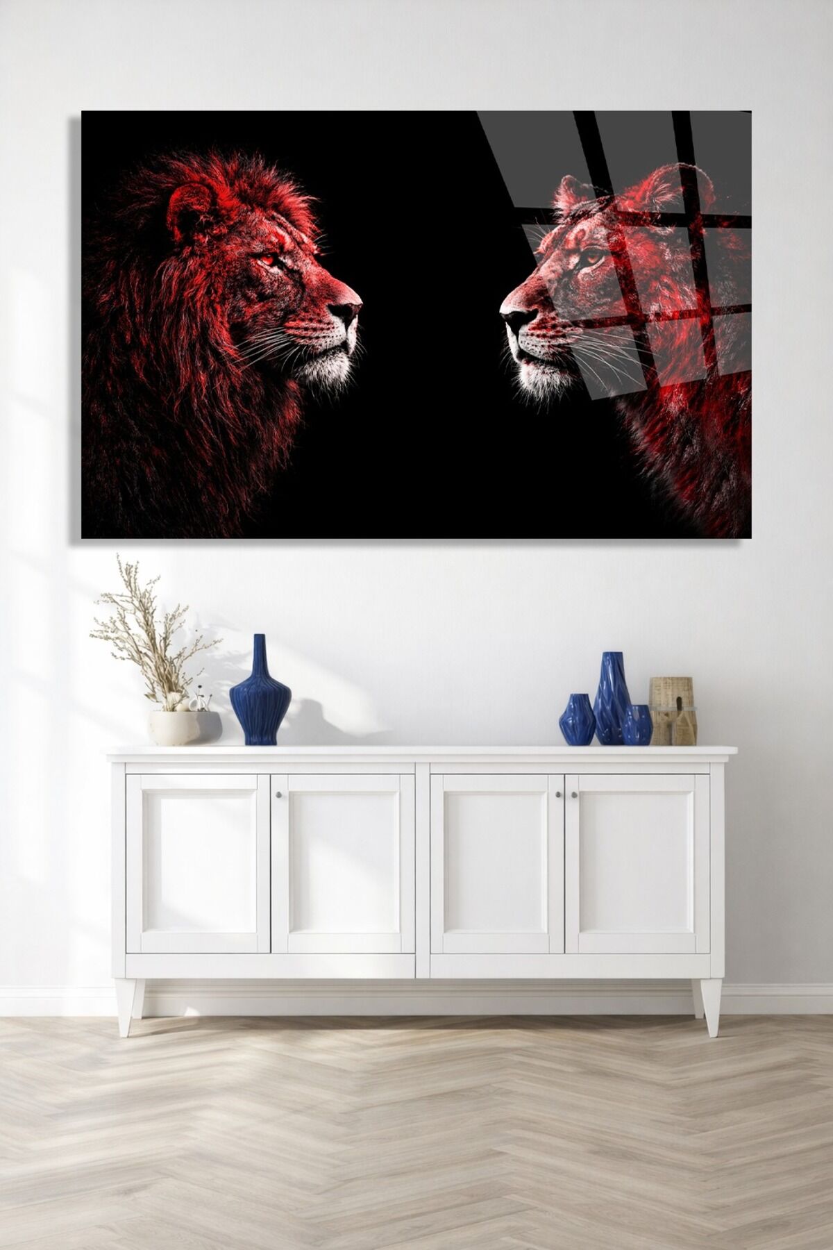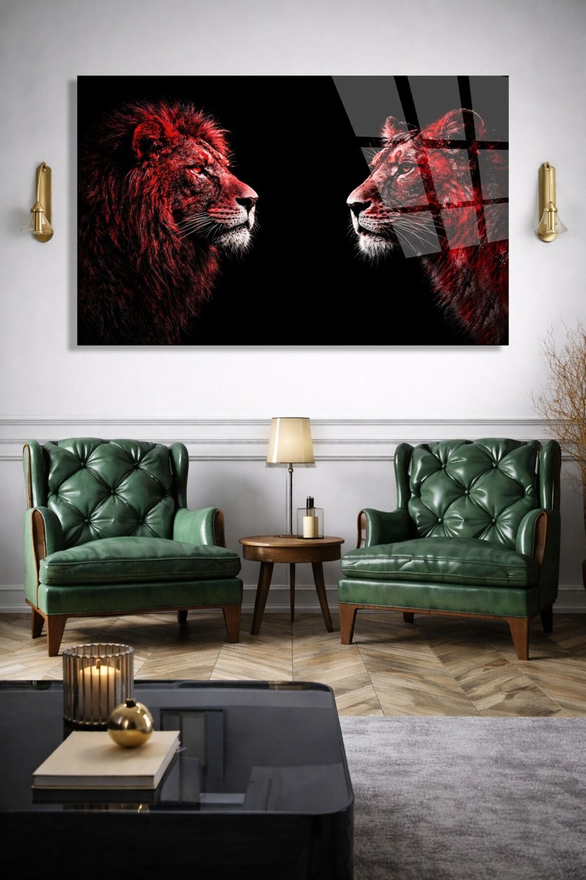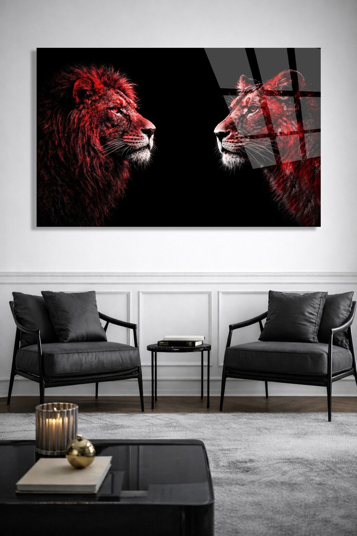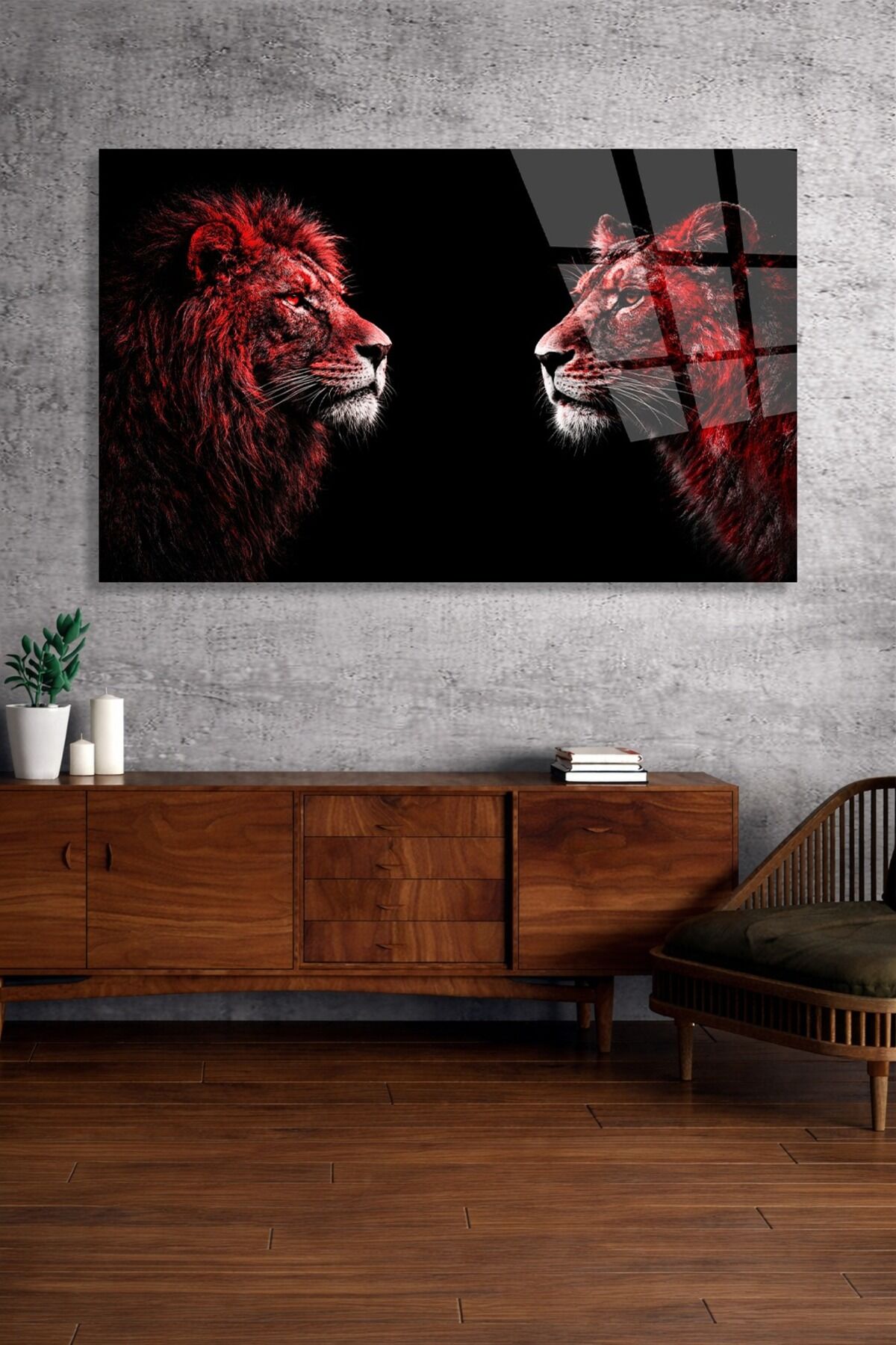 DEKORATİF KIRILMAZ CAM TABLO KARŞILIKLI ASLAN SANATI Kırmızı