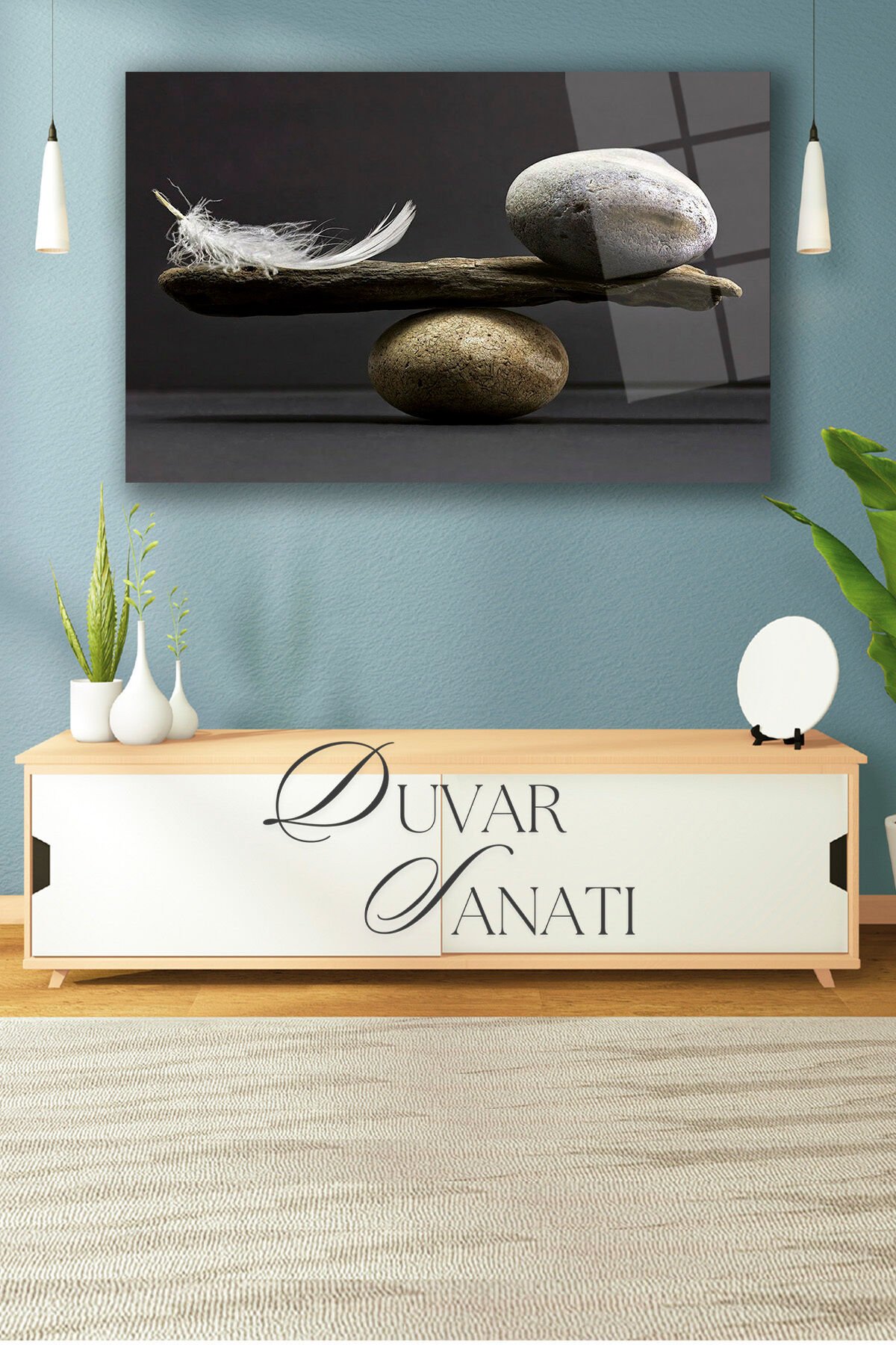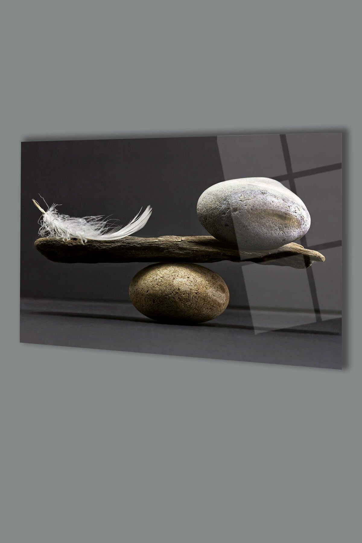 Denge Taş ve Tüy Cam Tablo, Hediyelik, Ev Ofis Salon Büyük Duvar Dekoru Gri Kahverengi