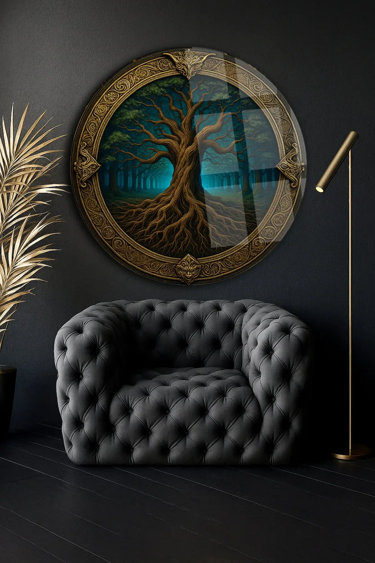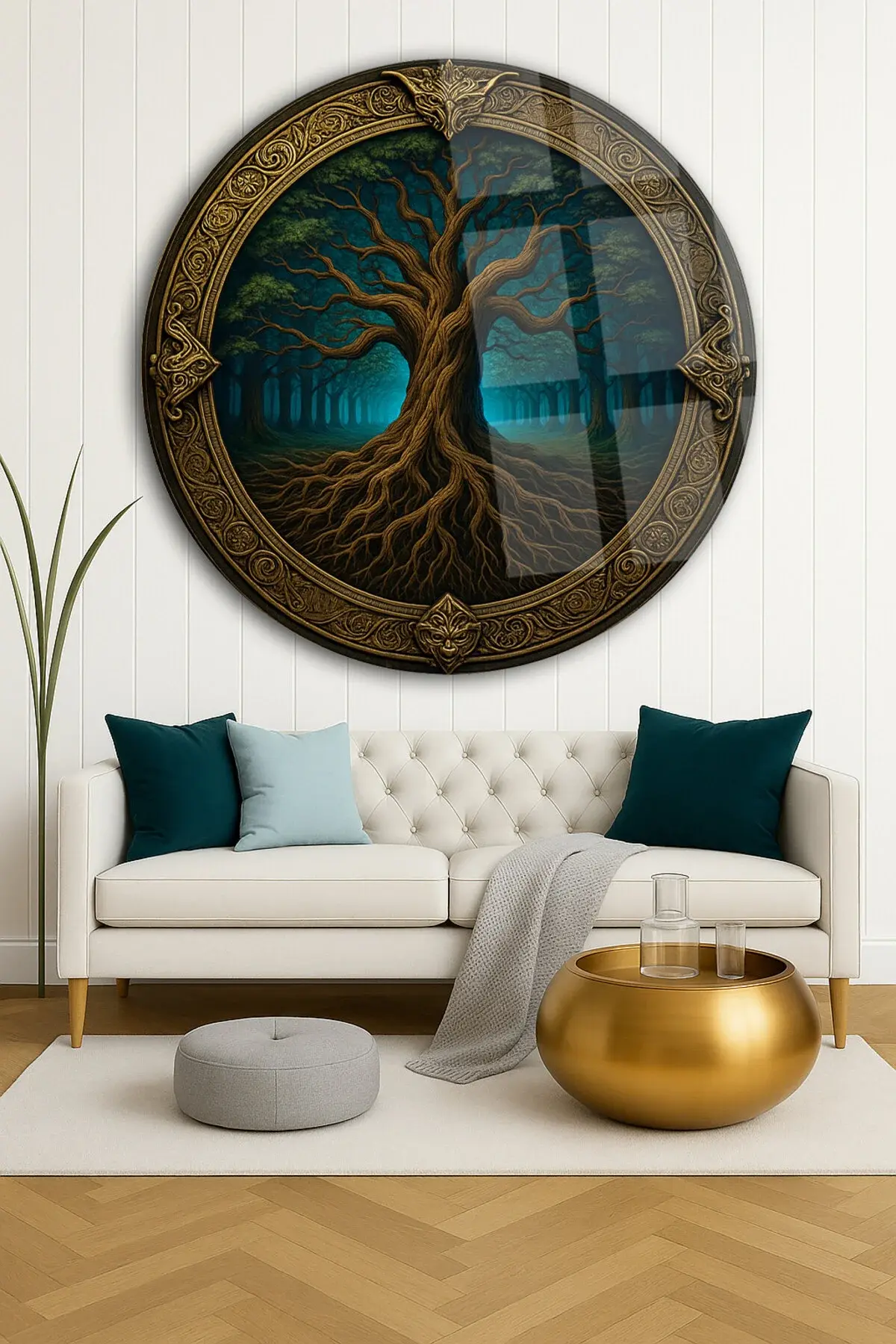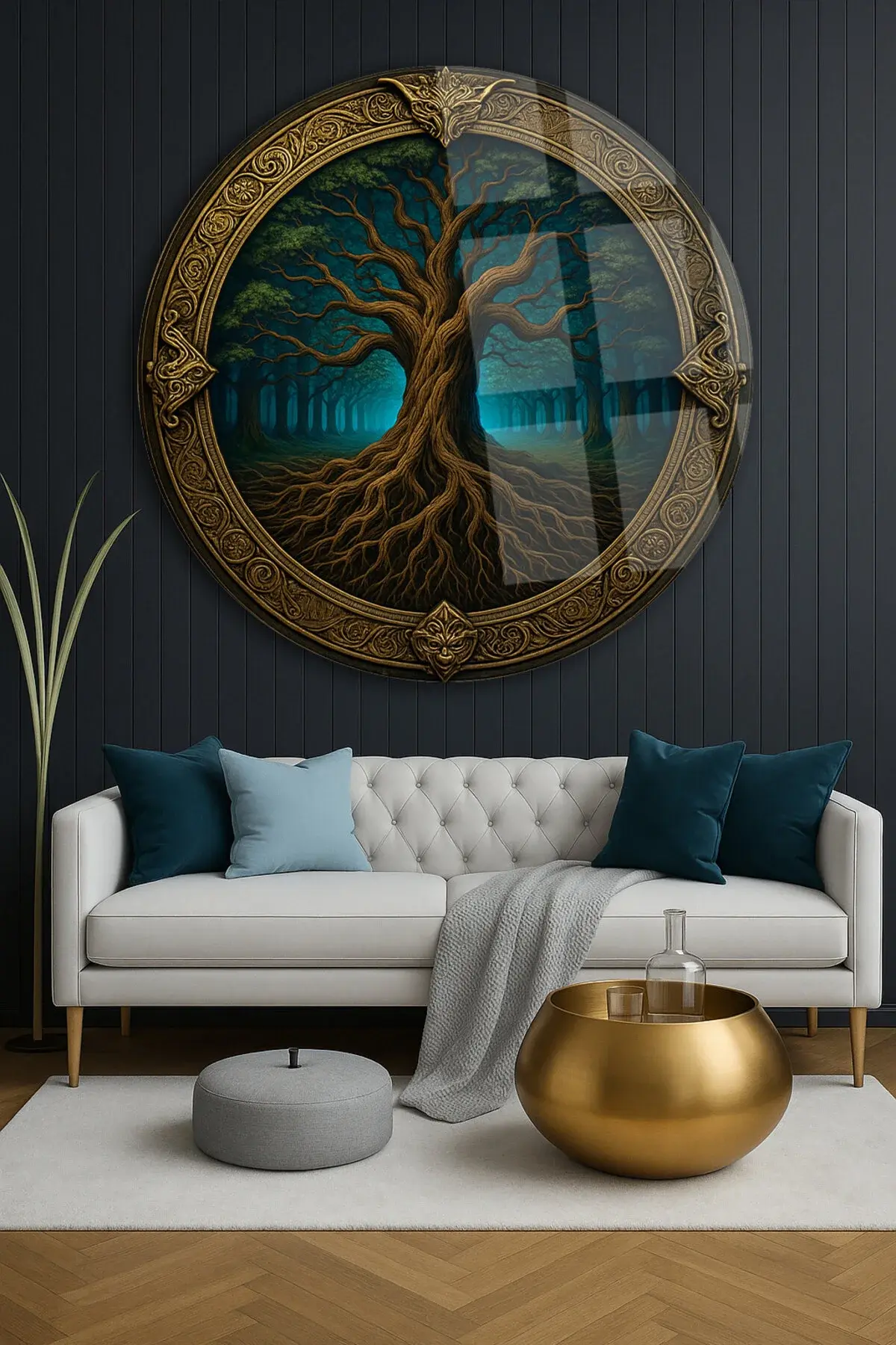 DESTANSI AĞAÇ TASARIMI MODERN TABLO KIRILMAZ LÜKS CAM TABLO YUVARLAK CAM TABLO EV HEDİYESİ Lacivert