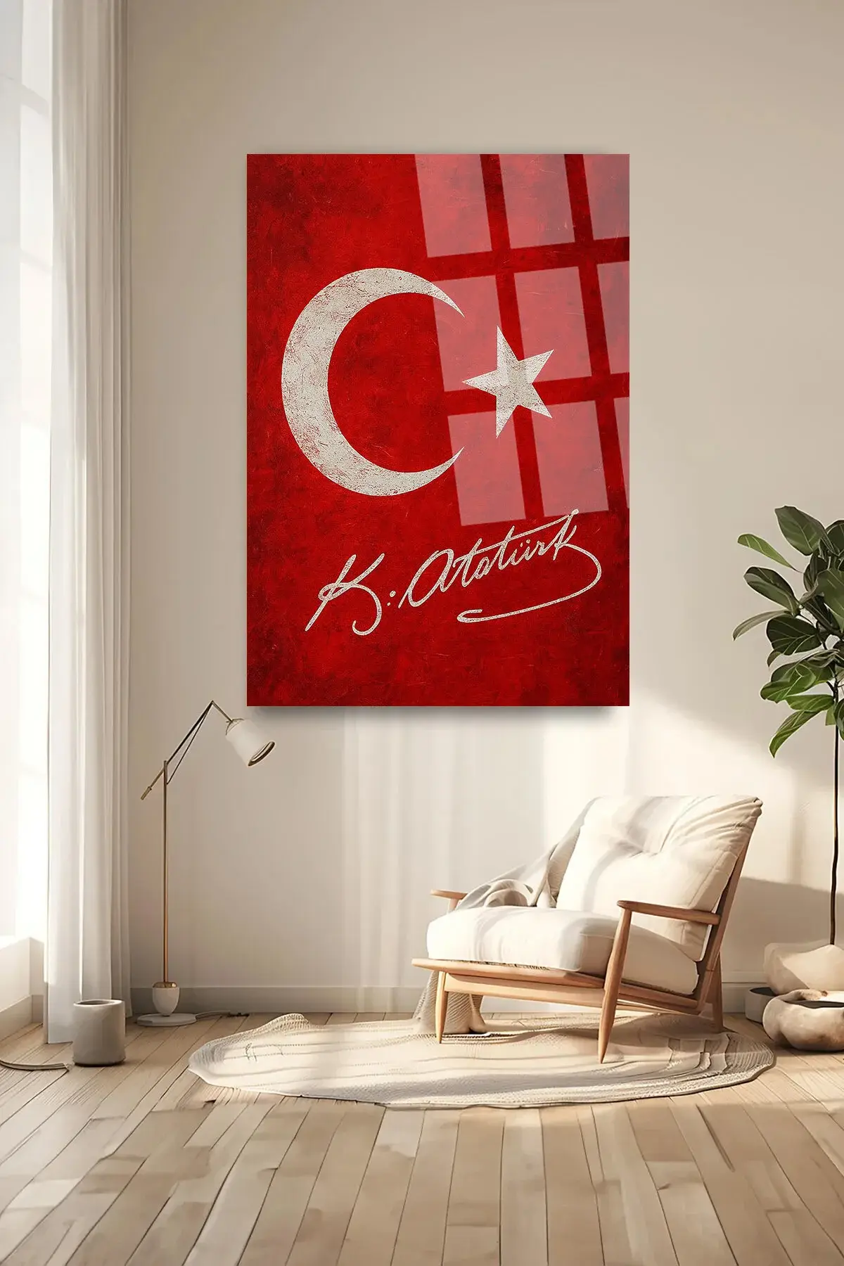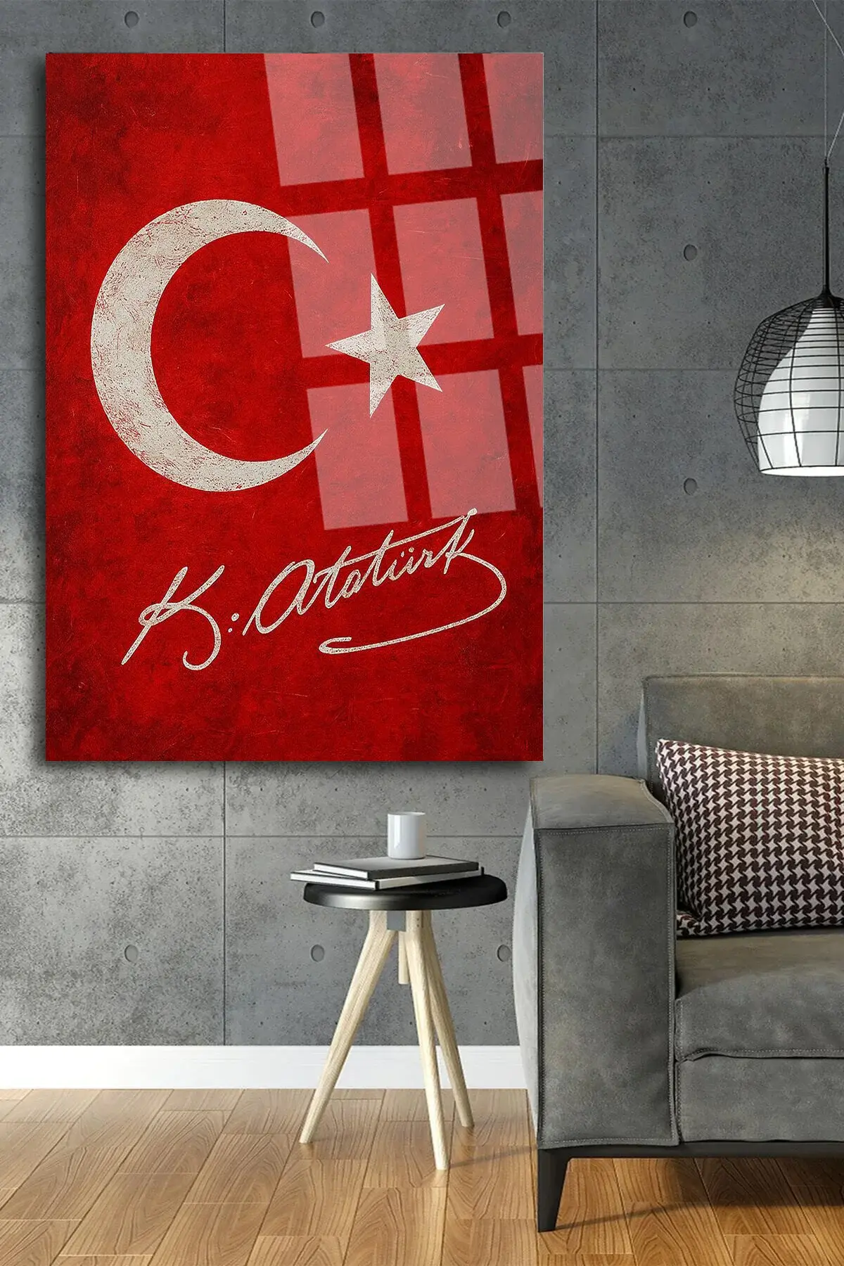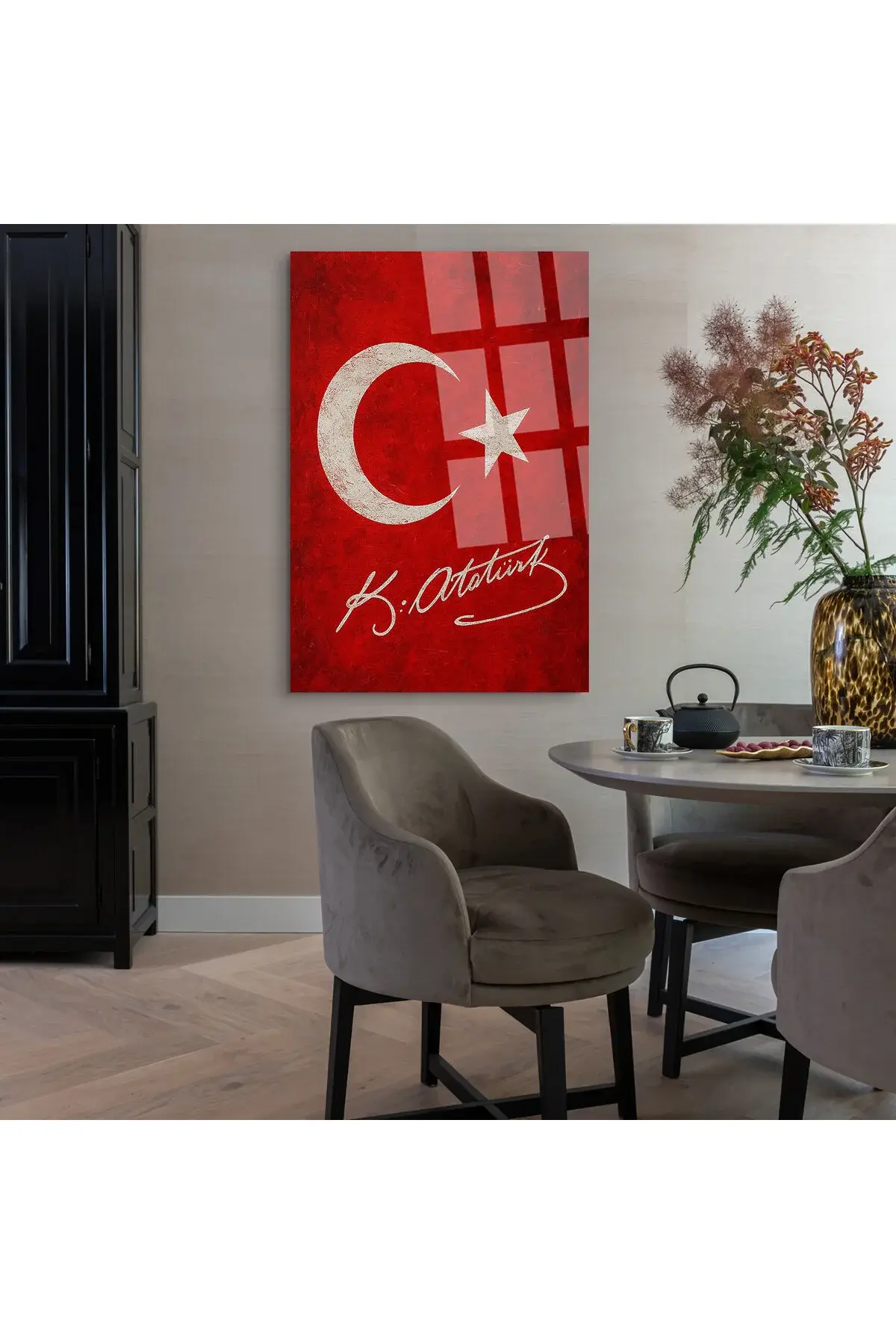 DİKEY TÜRK BAYRAĞI ATATÜRK İMZALI KIRILMAZ CAM TABLO ATATÜRK TABLOSU TÜRK BAYRAĞI Kırmızı