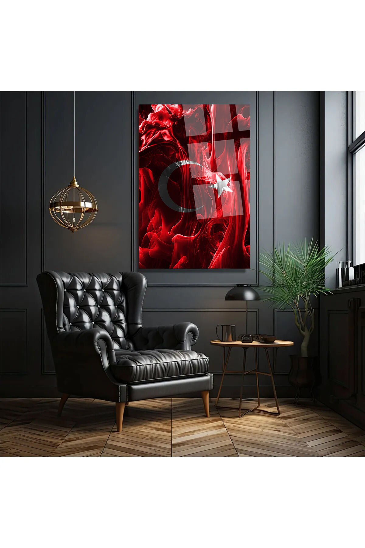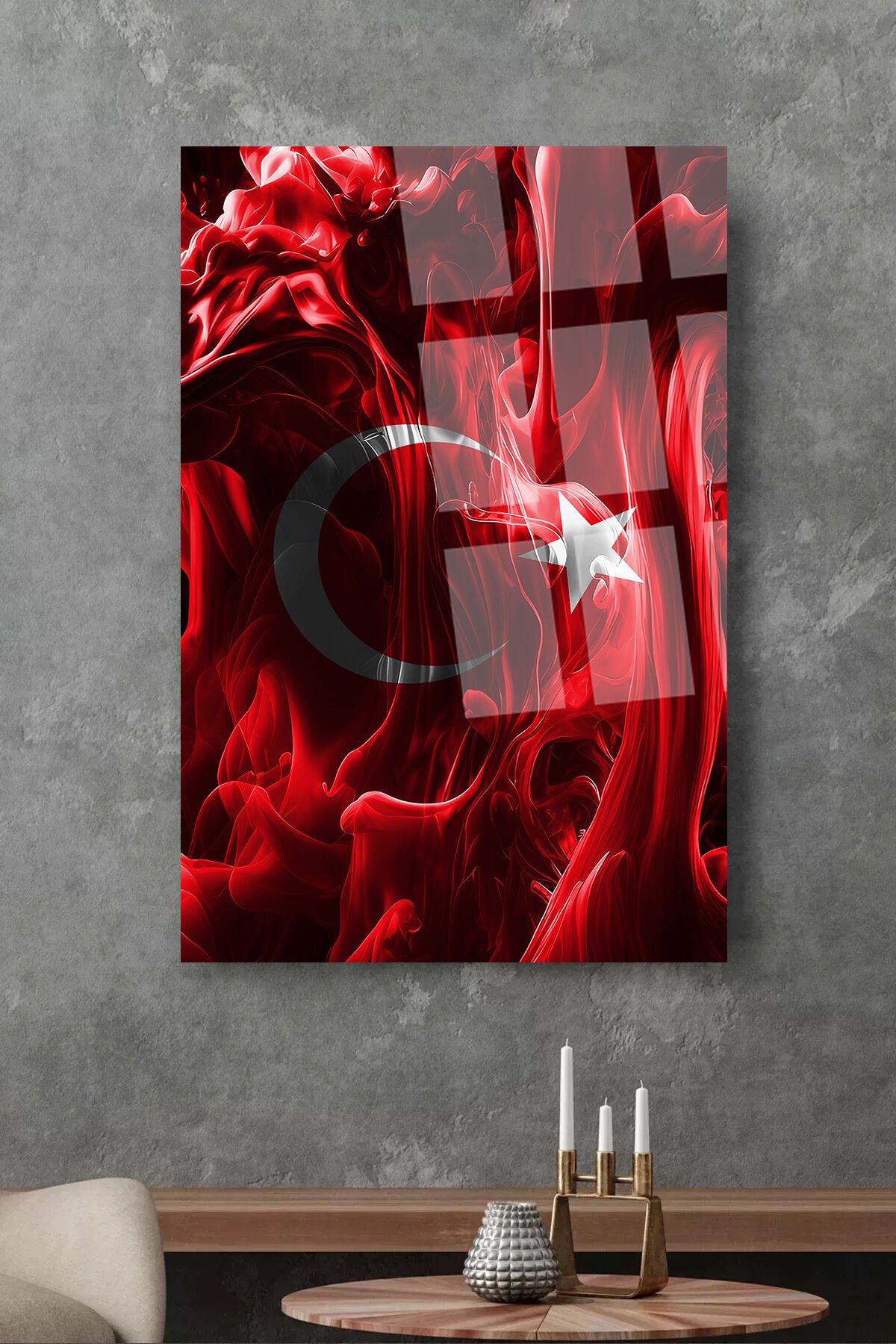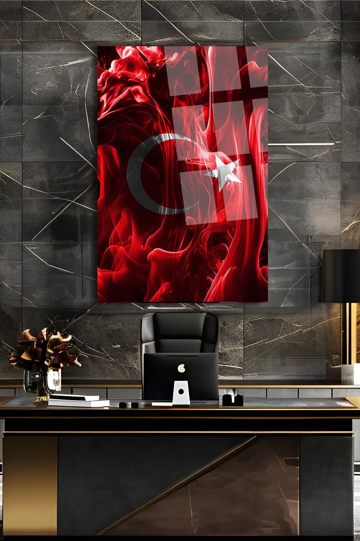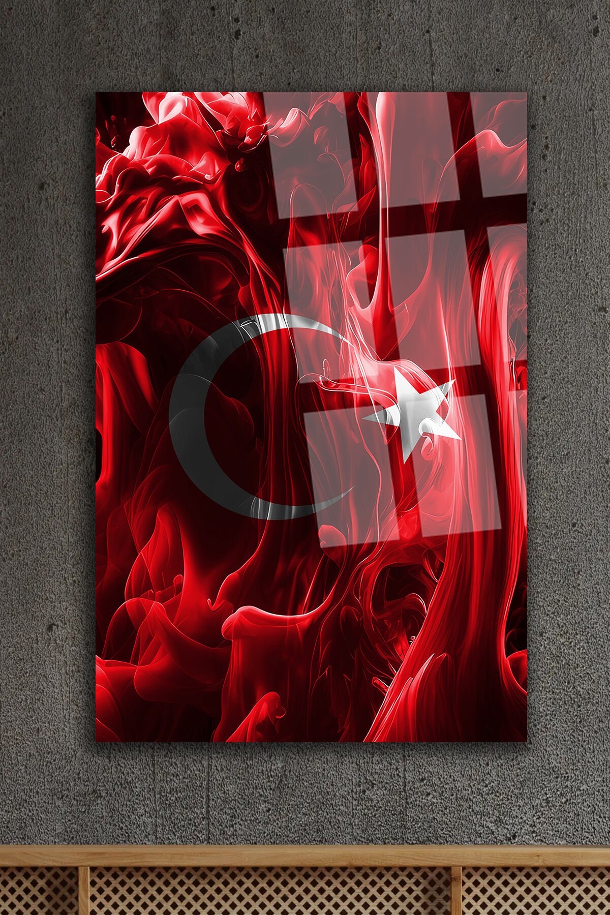 Dikey Türk Bayrağı Dumanlar İçinde Ay Yıldız Tasarımı Ofis İş Yeri Hediyesi Cam Tablo Kırmızı