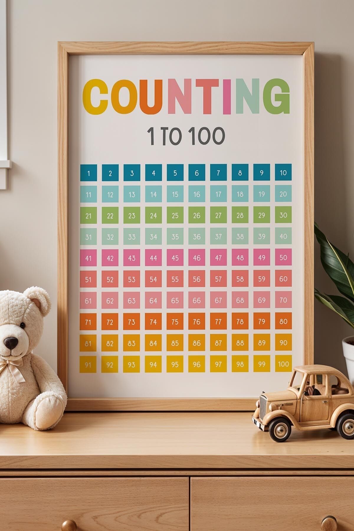 DOĞAL AHŞAP - 1'den 100'e Kadar Sayılar Öğretici Çocuk Odası Ahşap Çerçeveli Duvar Tablosu