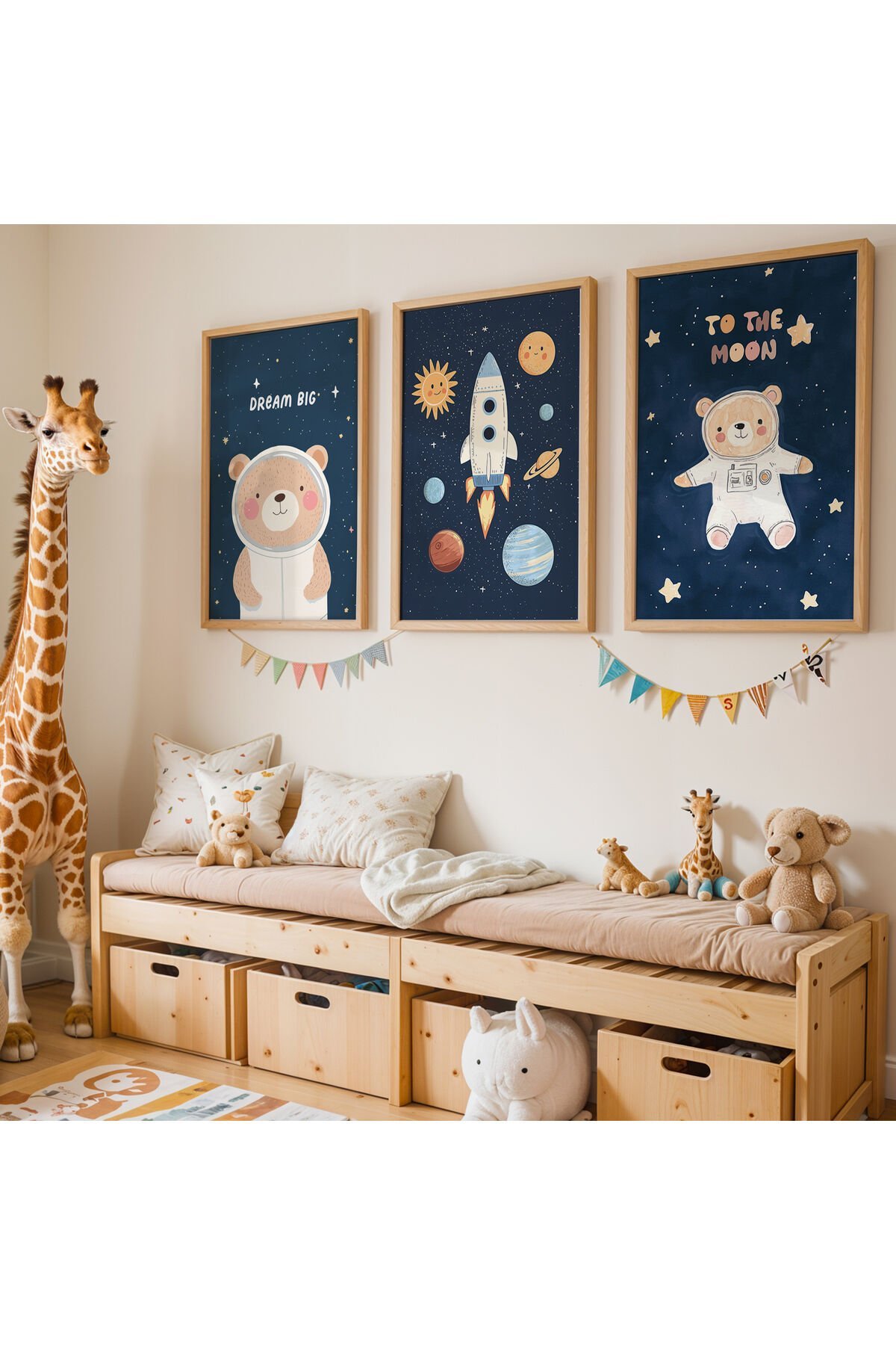DOĞAL AHŞAP - 3'lü Astronot Ayıcık ve Gezegen Doğal Ahşap Çerçeveli Çocuk Odası ve Bebek Odası Tablo Seti