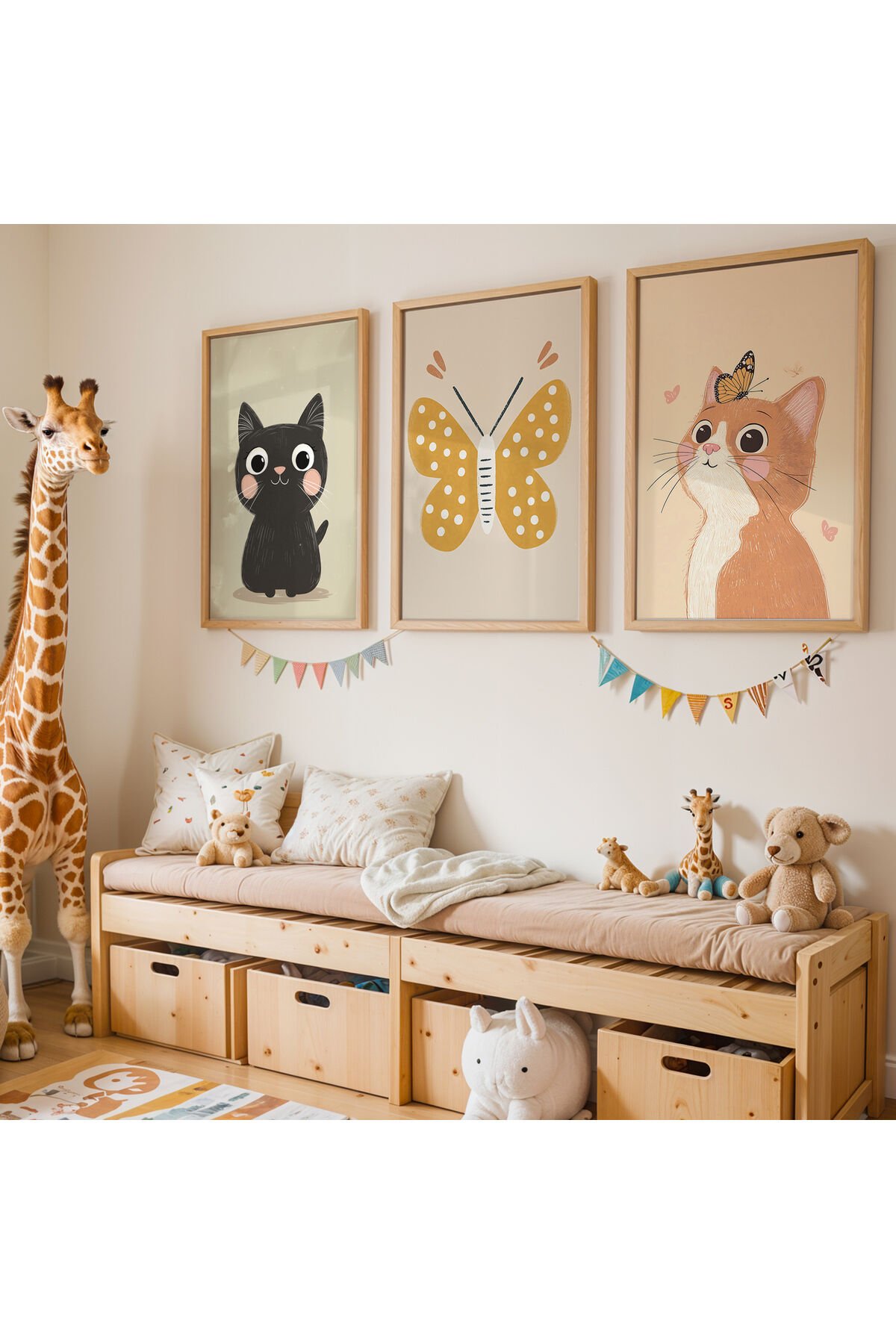 DOĞAL AHŞAP - 3'lü Sevimli Kedicikler Doğal Ahşap Çerçeveli Çocuk Odası ve Bebek Odası Tablo Seti