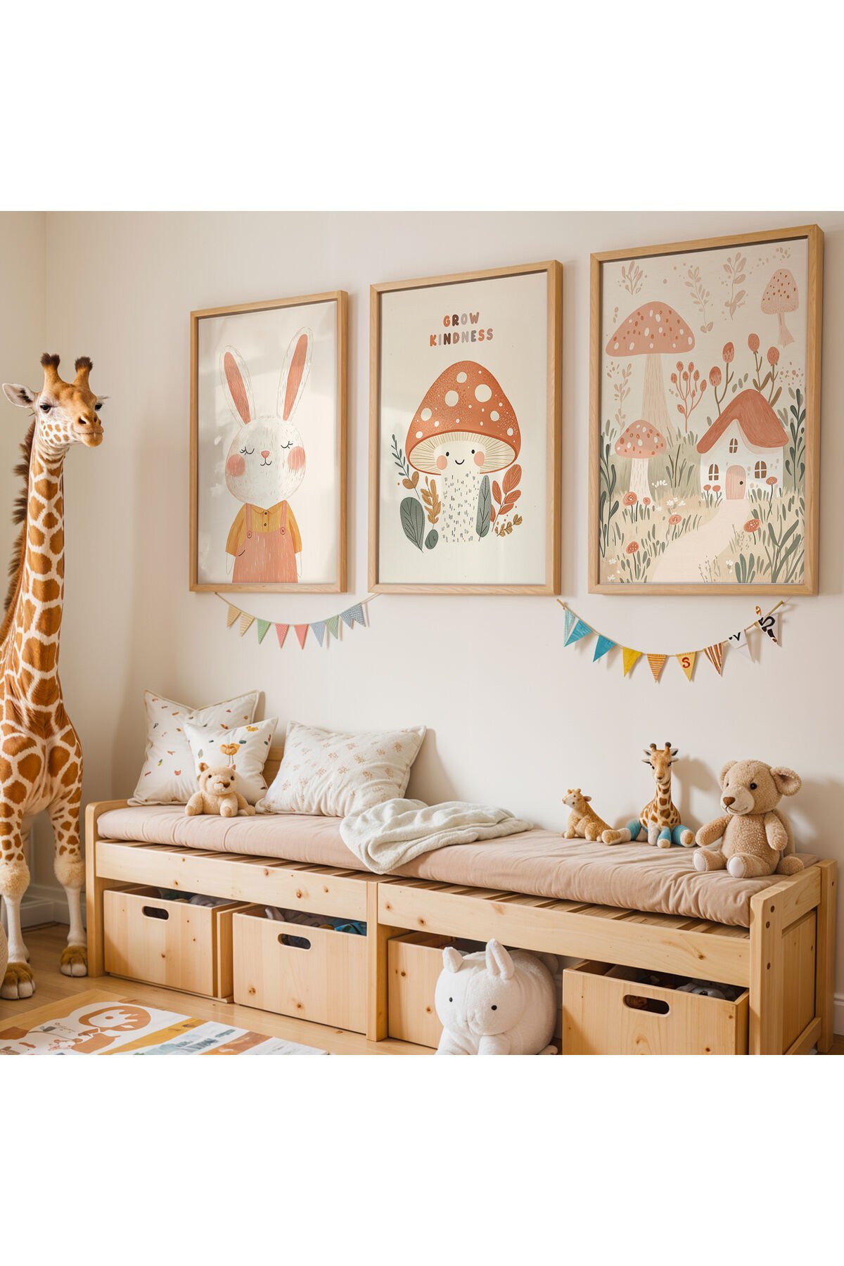 DOĞAL AHŞAP - 3'lü Sevimli Tavşan Doğal Ahşap Çerçeveli Çocuk Odası ve Bebek Odası Tablo Seti