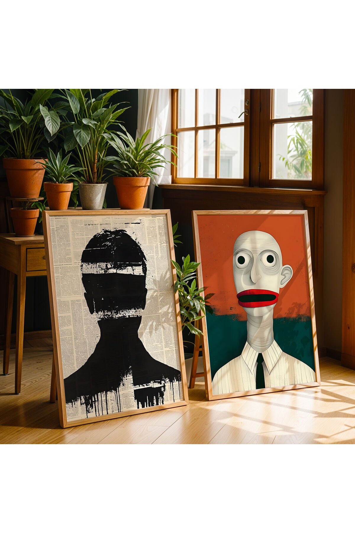 DOĞAL AHŞAP - Abstract Figürler İkili Doğal Ahşap Çerçeveli Duvar Tablo Seti