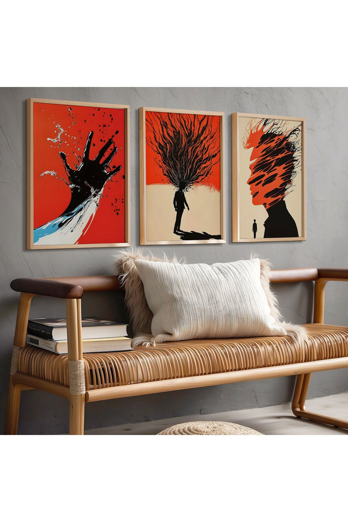 DOĞAL AHŞAP - Abstract İçgörü ve Zihin Gücü Üçlü Doğal Ahşap Çerçeveli Duvar Tablo Seti