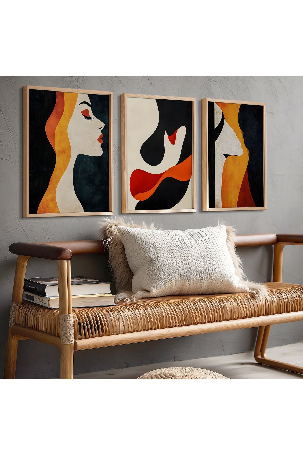 DOĞAL AHŞAP - Abstract Modern Figüratif Sanat Üçlü Doğal Ahşap Çerçeveli Duvar Tablo Seti