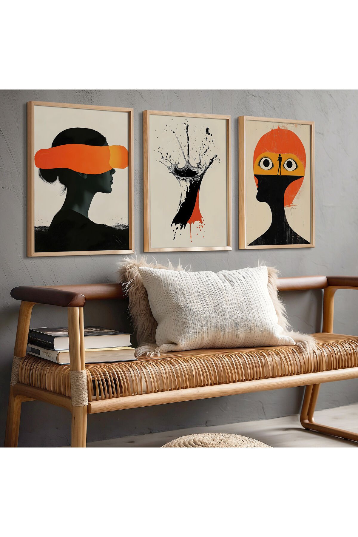 DOĞAL AHŞAP - Abstract Modern Siluet Üçlü Doğal Ahşap Çerçeveli Duvar Tablo Seti