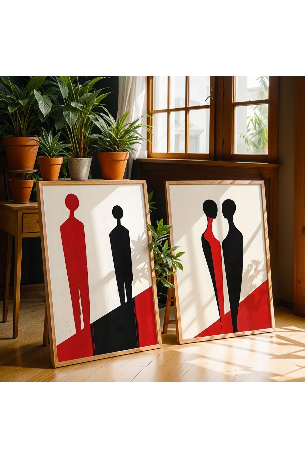 DOĞAL AHŞAP - Abstract Portre Sanatı İkili Doğal Ahşap Çerçeveli Duvar Tablo Seti