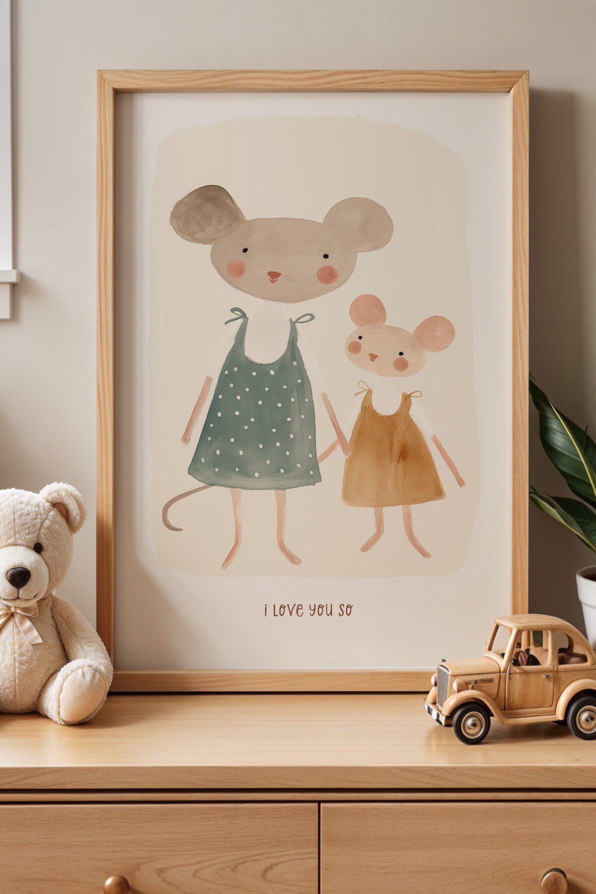 DOĞAL AHŞAP - Anne ve Çocuk Fare Sevgisi - Doğal Ahşap Çerçeveli Çocuk ve Bebek Odası Tablosu
