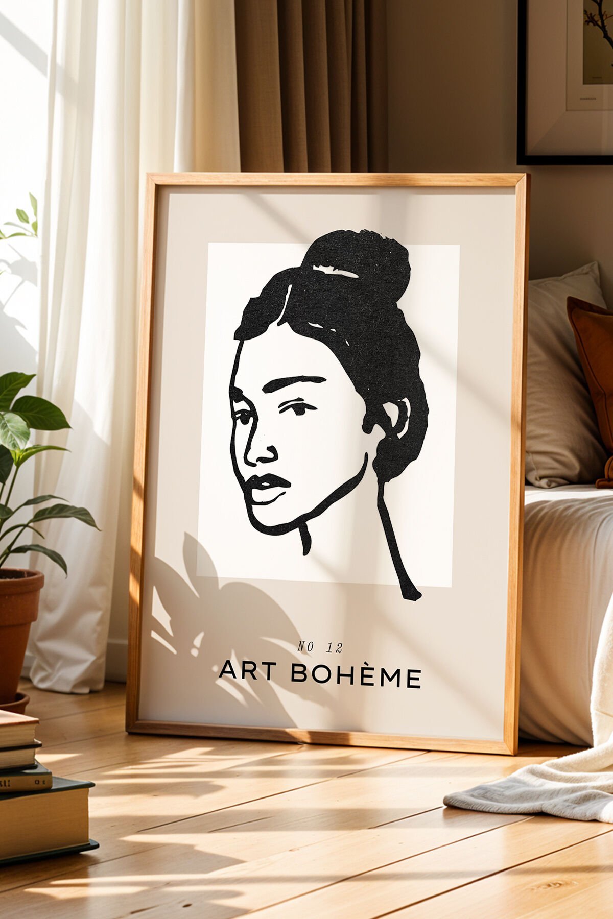 DOĞAL AHŞAP - Art Bohem Kadın Portre Çizimi Doğal Ahşap Çerçeveli Duvar Tablosu