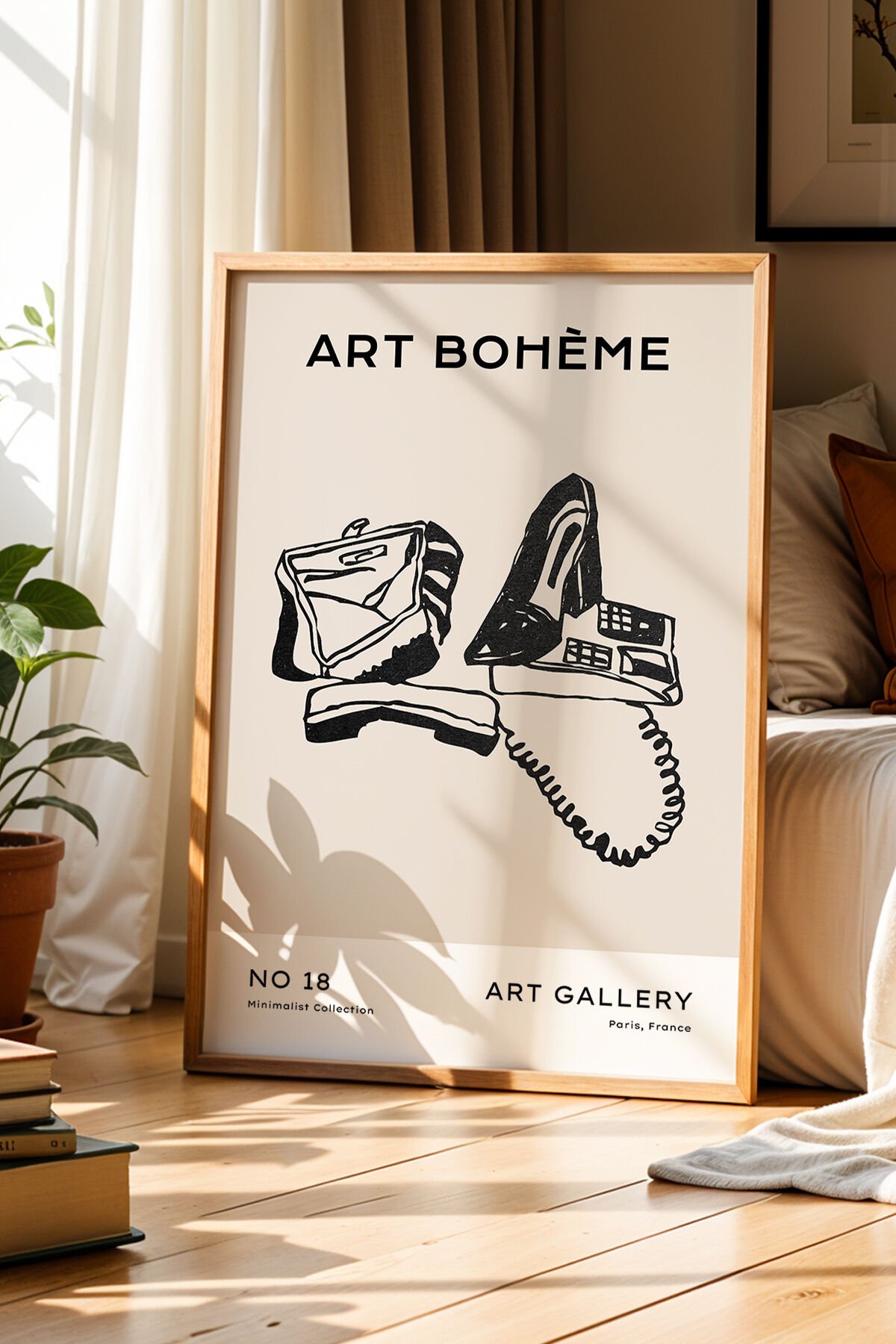 DOĞAL AHŞAP - Art Bohem Minimalist Çizimi Doğal Ahşap Çerçeveli Duvar Tablosu
