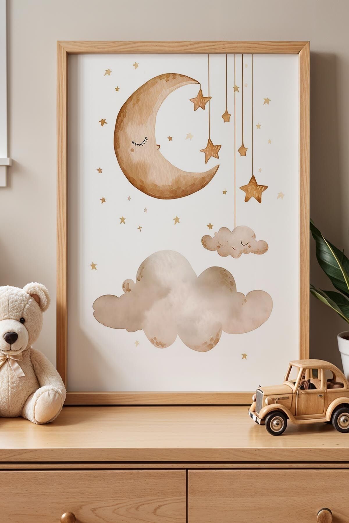 DOĞAL AHŞAP - Ay Bulut Ve Yıldızlar Çocuk Odası Ahşap Çerçeveli Duvar Tablosu