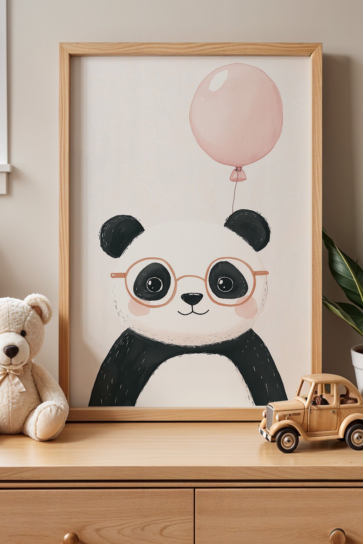 DOĞAL AHŞAP - Balonlu Gözlüklü Panda - Doğal Ahşap Çerçeveli Çocuk Odası ve Bebek Odası Tablosu