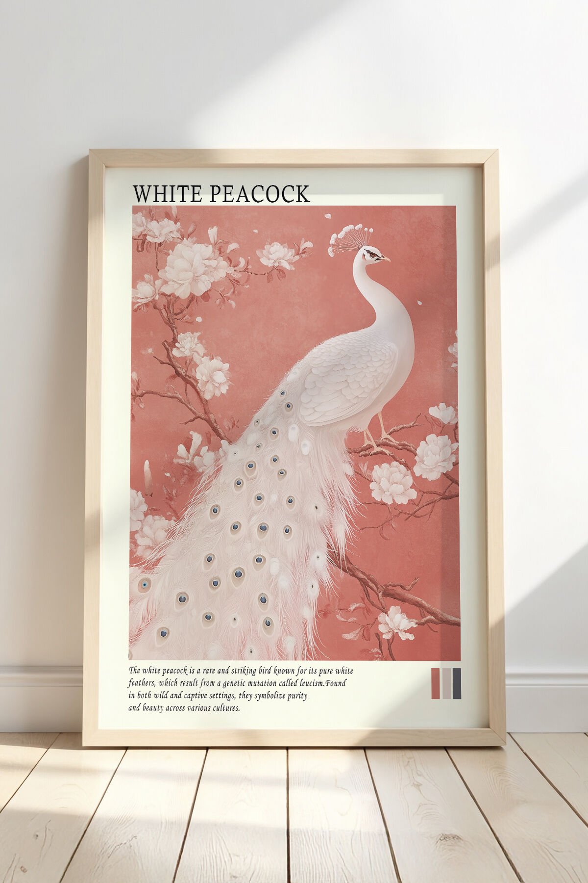 DOĞAL AHŞAP - Beyaz Tavus Kuşu ve Çiçekler Doğal Ahşap Çerçeveli Duvar Tablosu