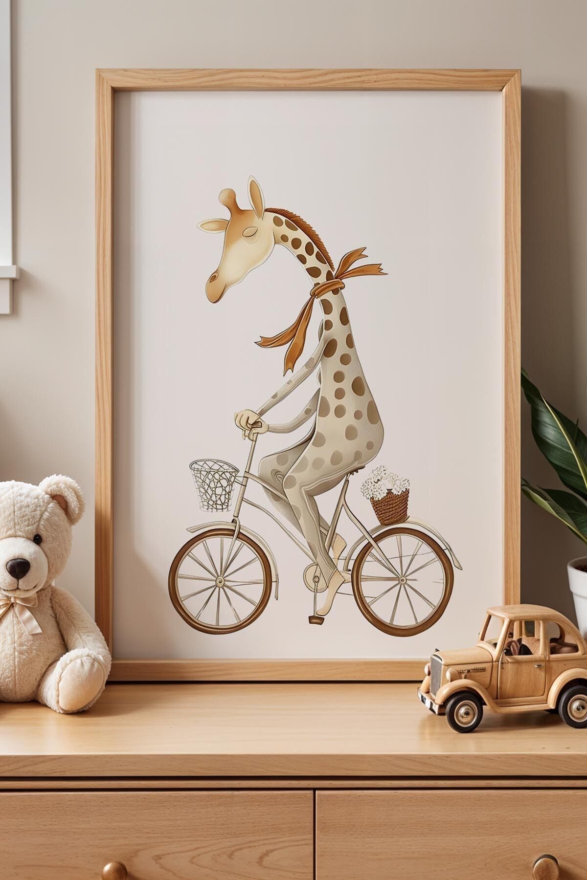 DOĞAL AHŞAP - Bisiklet Süren Zürafa Çocuk Odası Ahşap Çerçeveli Duvar Tablosu