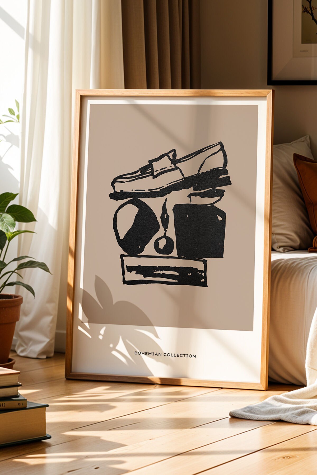 DOĞAL AHŞAP - Bohem Denge ve Obje Çizimi Doğal Ahşap Çerçeveli Duvar Tablosu