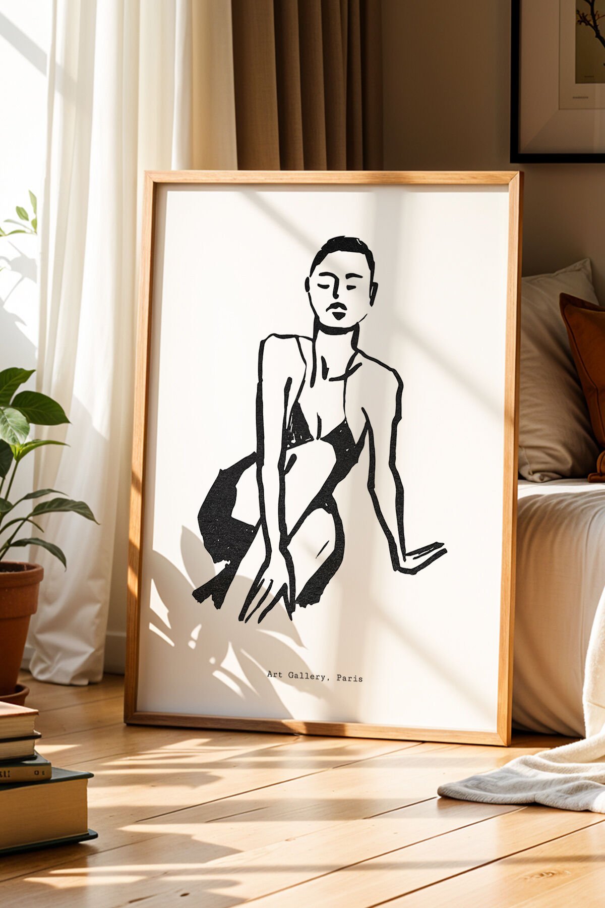 DOĞAL AHŞAP - Bohem Dokunuş Minimalist Kadın Figürü Doğal Ahşap Çerçeveli Duvar Tablosu