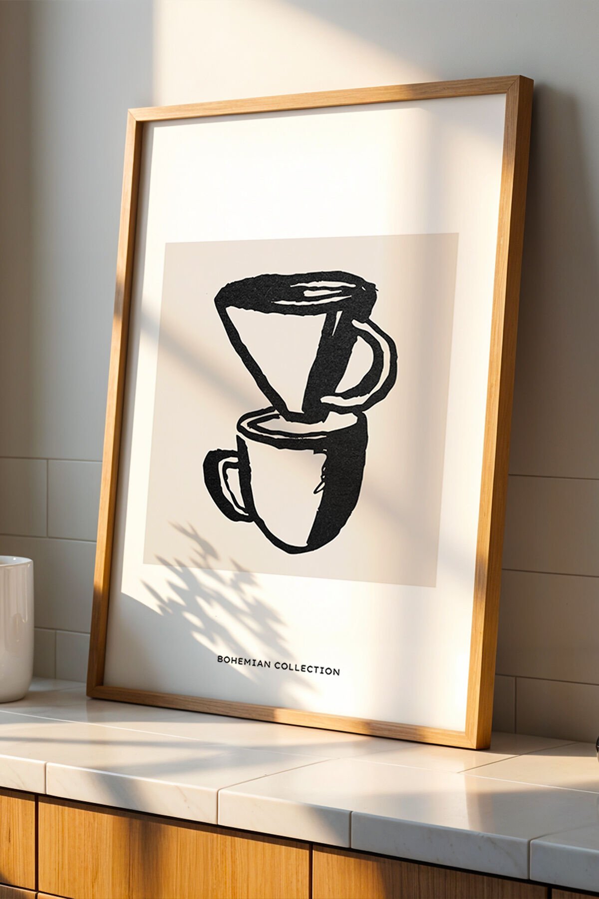 DOĞAL AHŞAP - Bohem Kahve Molası - Filtre Kahve Minimalist Çizim Ahşap Çerçeveli Mutfak Duvar Tablosu
