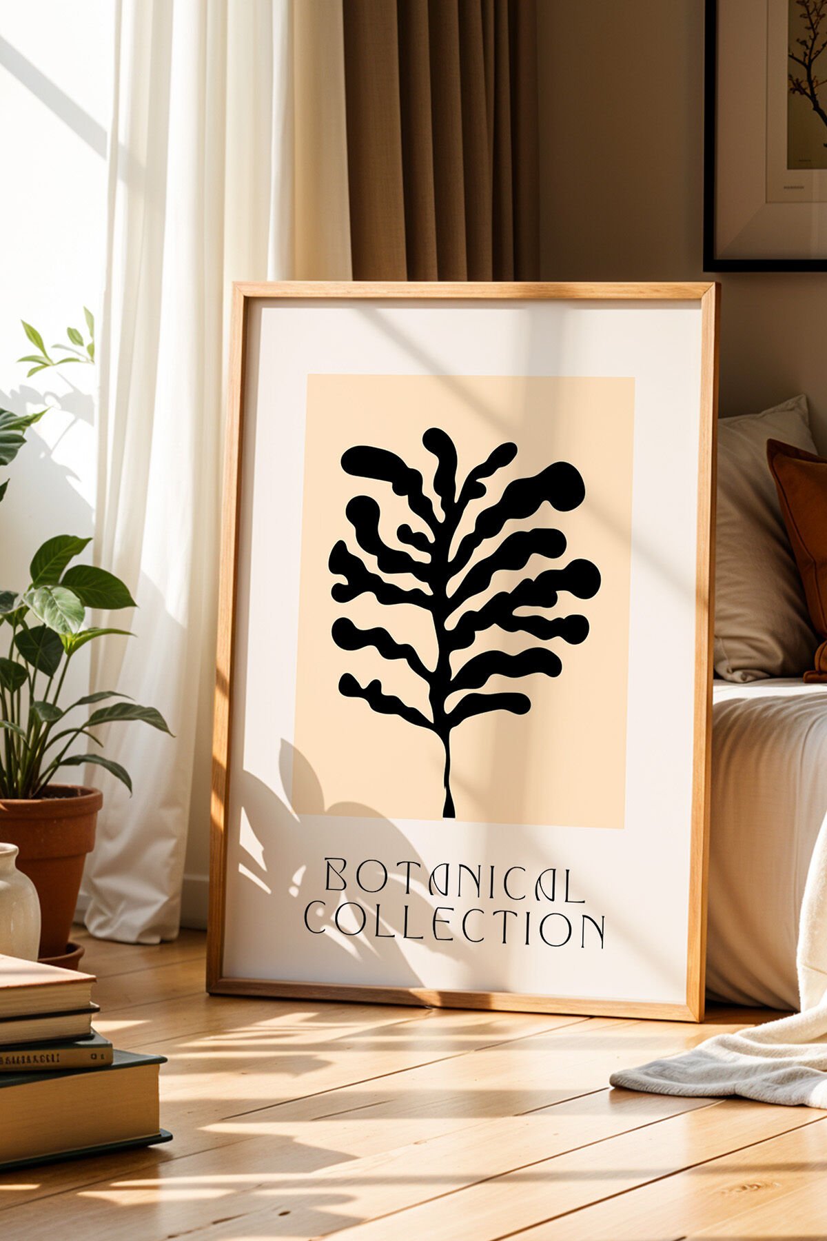 DOĞAL AHŞAP - Bohem Tarzı Botanik Çizim Bej Minimalist Doğal Ahşap Çerçeveli Duvar Tablosu