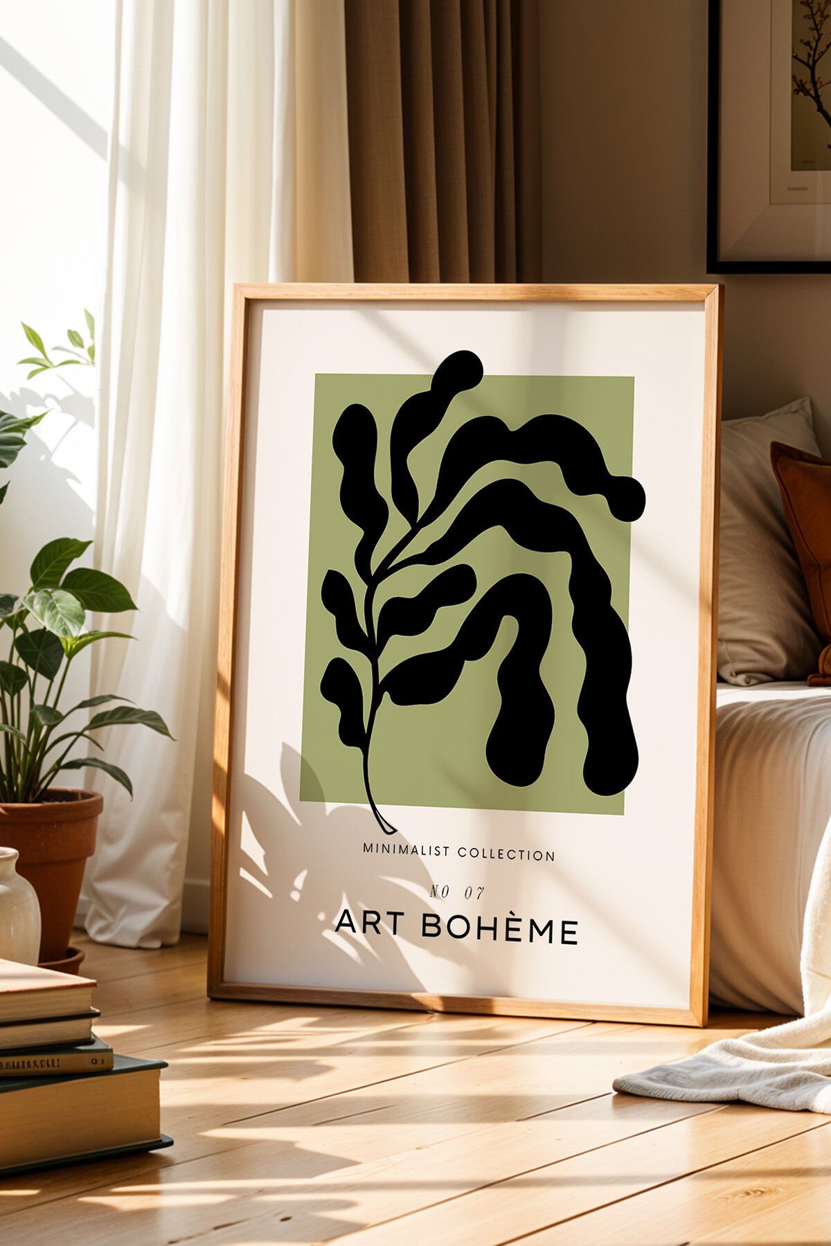 DOĞAL AHŞAP - Bohem Tarzı Botanik Yeşil Renkli Soyut Doğal Ahşap Çerçeveli Duvar Tablosu