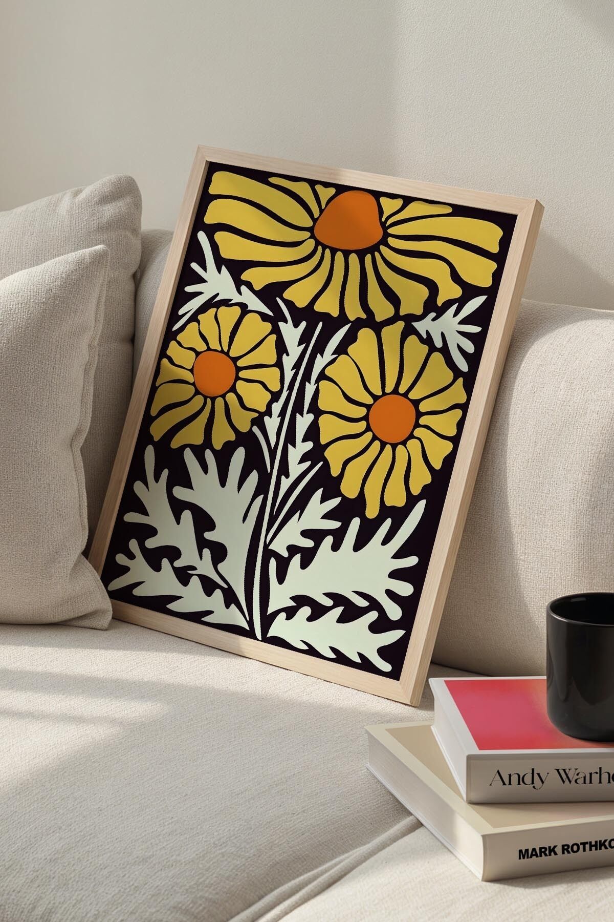 DOĞAL AHŞAP - Botanik Serisi Sarı Çiçekli Matisse Doğal Ahşap Çerçeveli Duvar Tablosu
