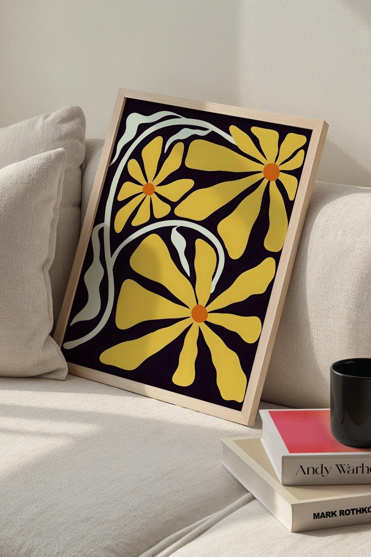 DOĞAL AHŞAP - Botanik Serisi Sarı Çiçekli Matisse Doğal Ahşap Çerçeveli Duvar Tablosu