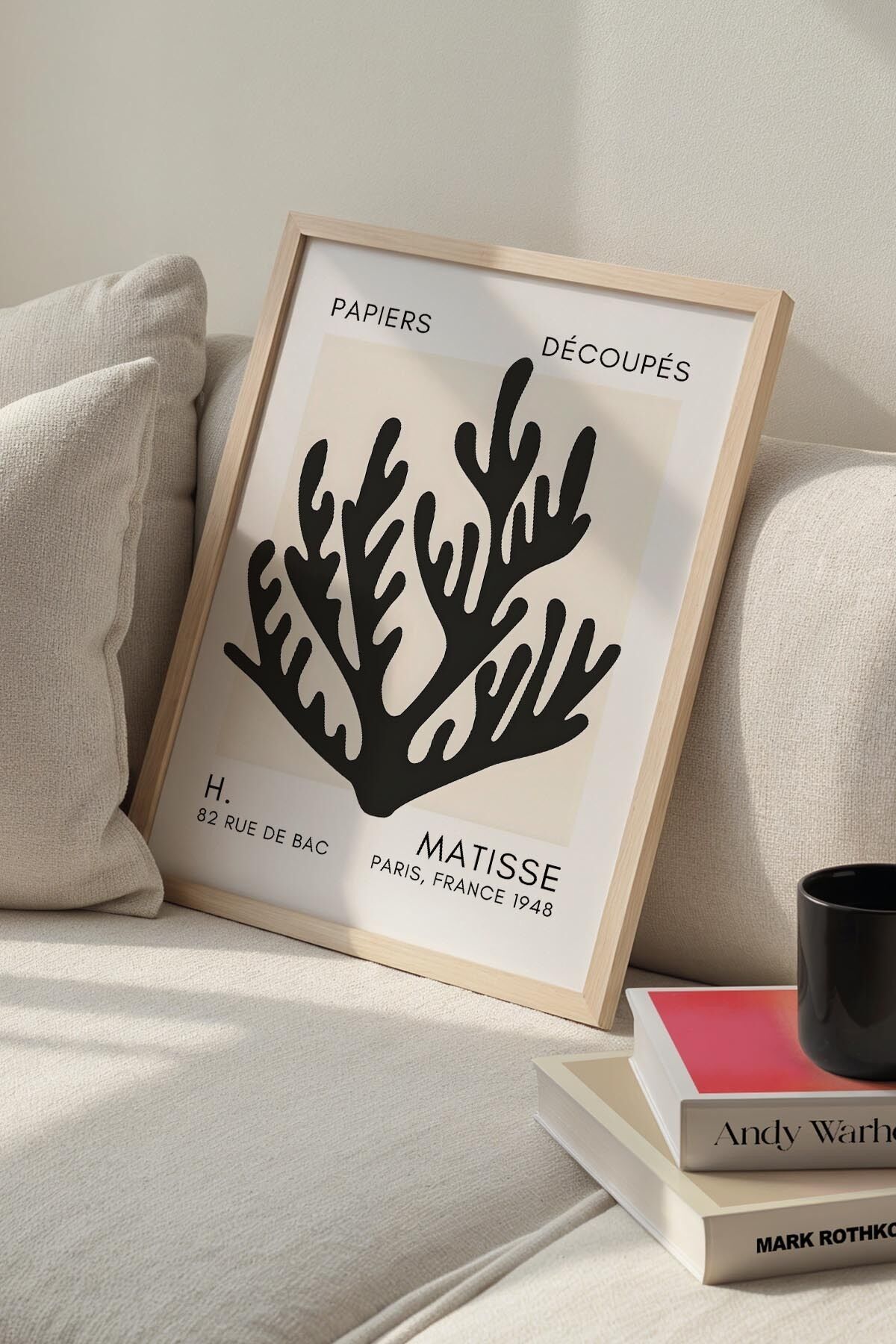 DOĞAL AHŞAP - Botanik Serisi Siyah Çiçekli Minimalist Matisse Doğal Ahşap Çerçeveli Duvar Tablosu