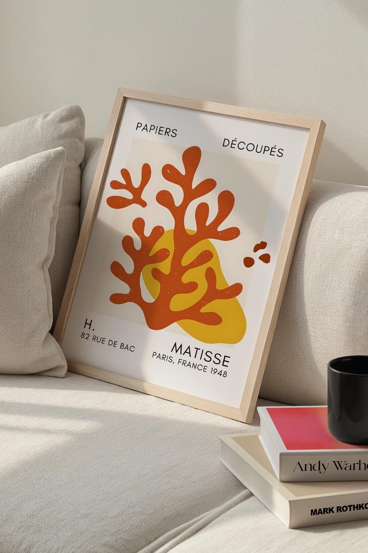 DOĞAL AHŞAP - Botanik Serisi Turuncu Çiçekli Matisse Doğal Ahşap Çerçeveli Duvar Tablosu