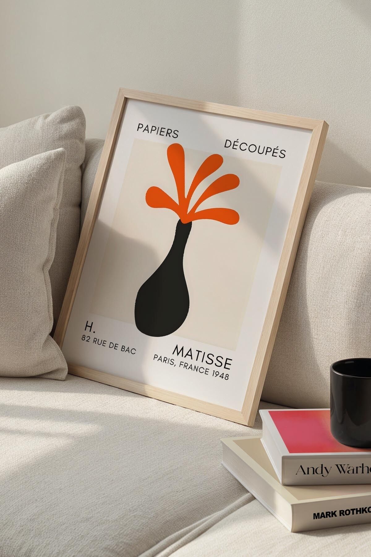 DOĞAL AHŞAP - Botanik Serisi Turuncu Siyah Çiçekli Matisse Doğal Ahşap Çerçeveli Duvar Tablosu