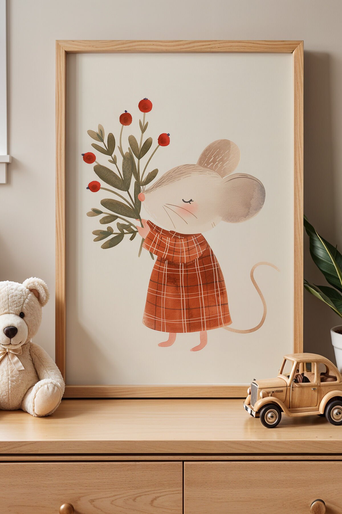 DOĞAL AHŞAP - Çiçek Buketi Taşıyan Fare - Doğal Ahşap Çerçeveli Çocuk ve Bebek Odası Tablosu
