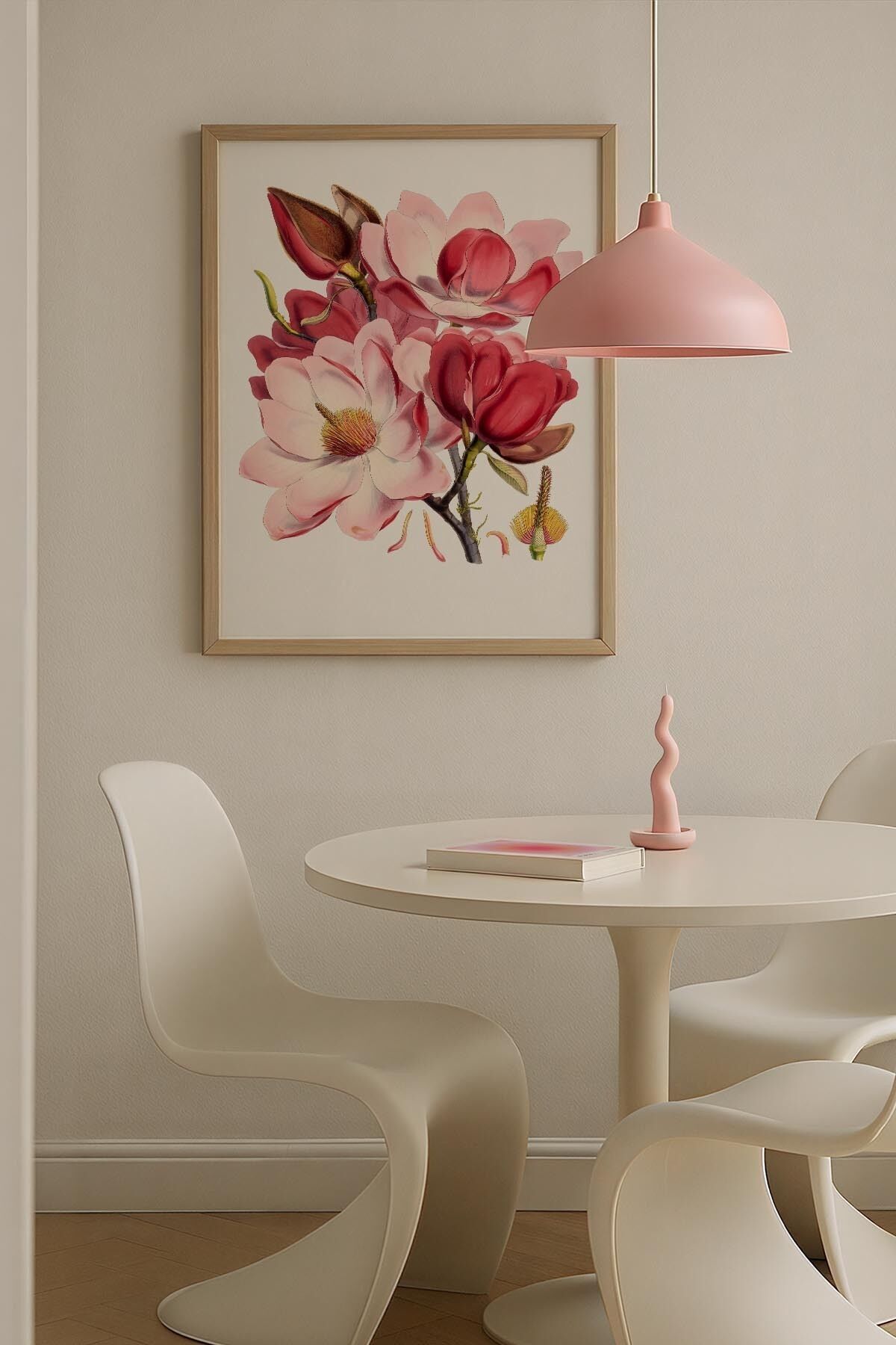 DOĞAL AHŞAP - Çiçek Temalı Pembe Maksimalist Sanatı Ahşap Çerçeveli Duvar Tablosu