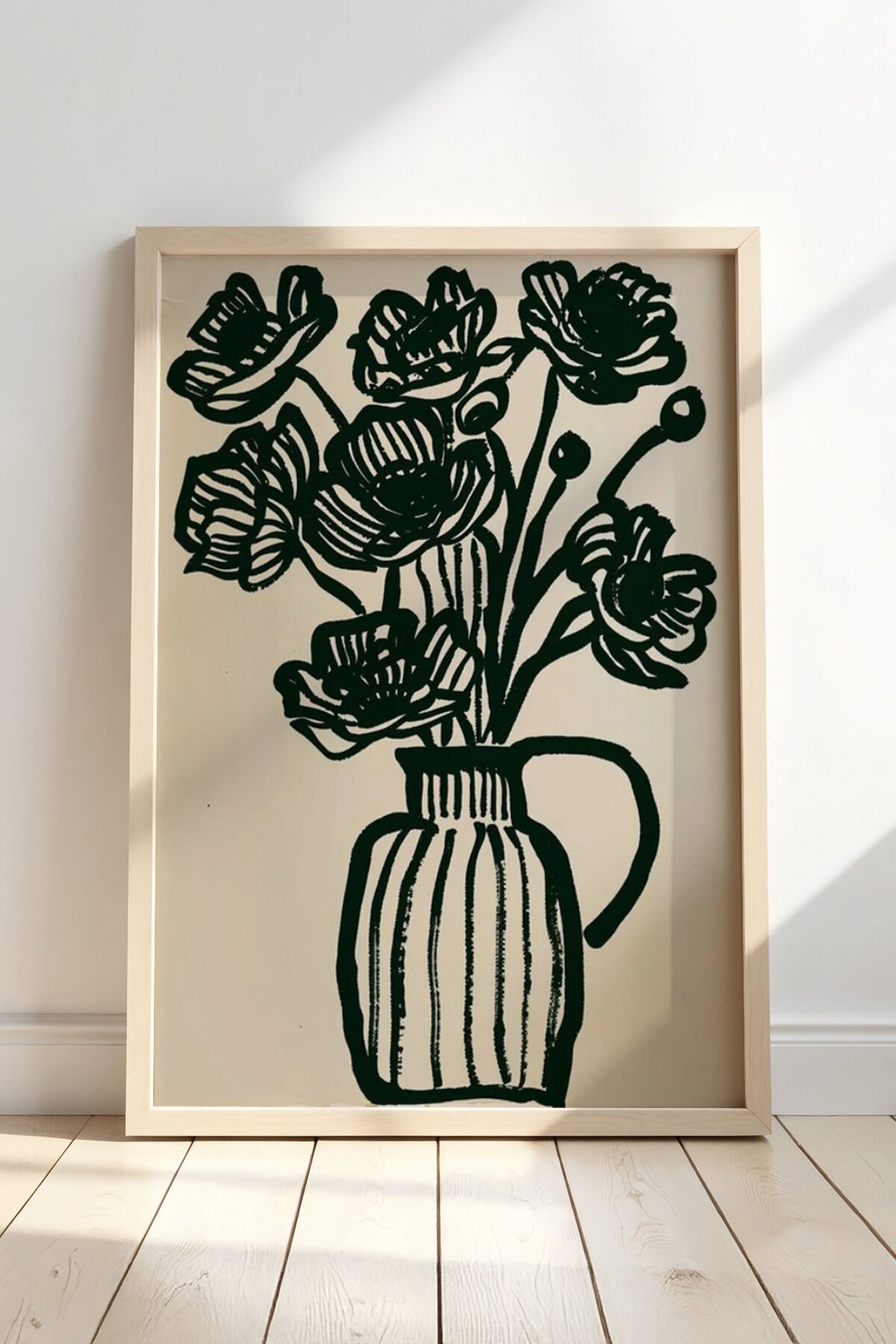 DOĞAL AHŞAP - Çiçek Vazosu Siyah Beyaz Baskı Sanatı Ahşap Çerçeveli Duvar Tablosu