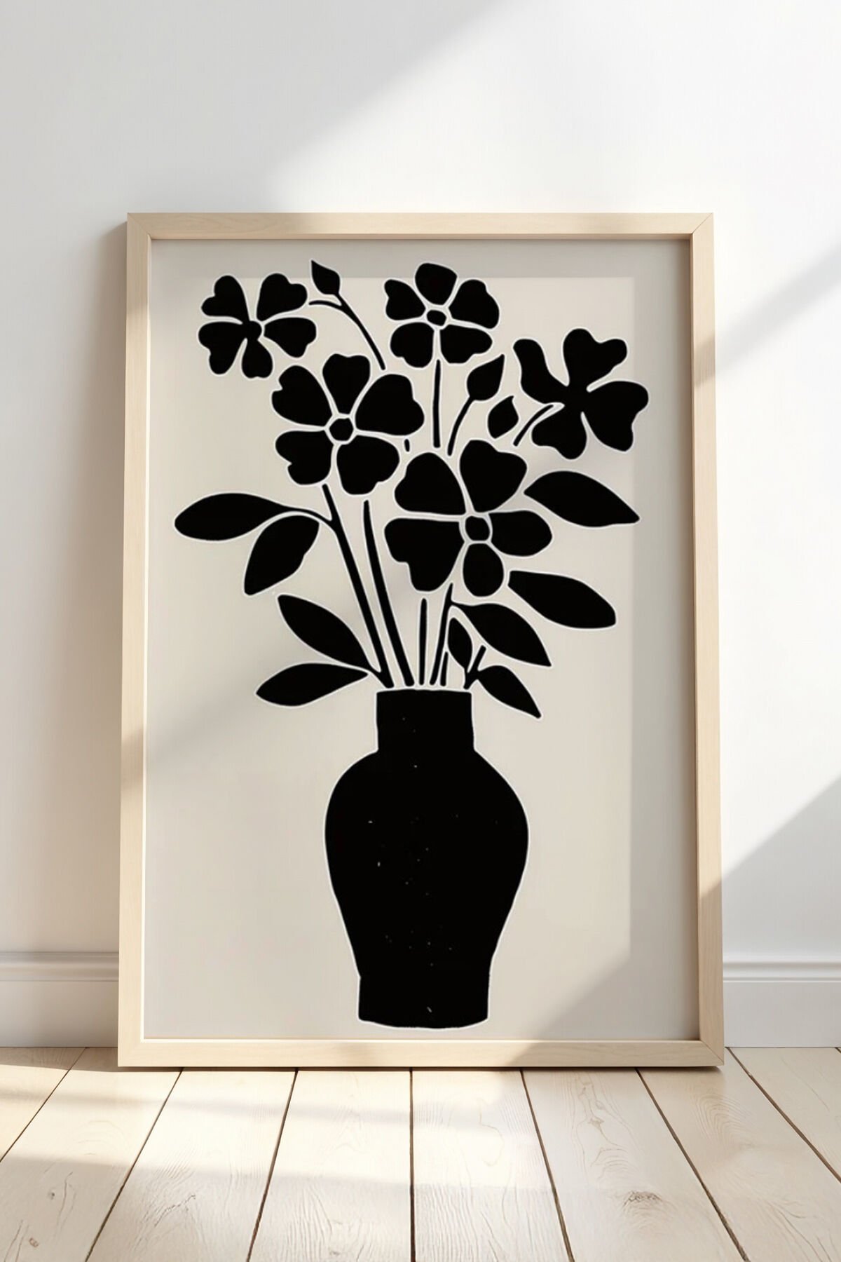 DOĞAL AHŞAP - Çiçek Vazosu Siyah Beyaz Baskı Sanatı Ahşap Çerçeveli Duvar Tablosu