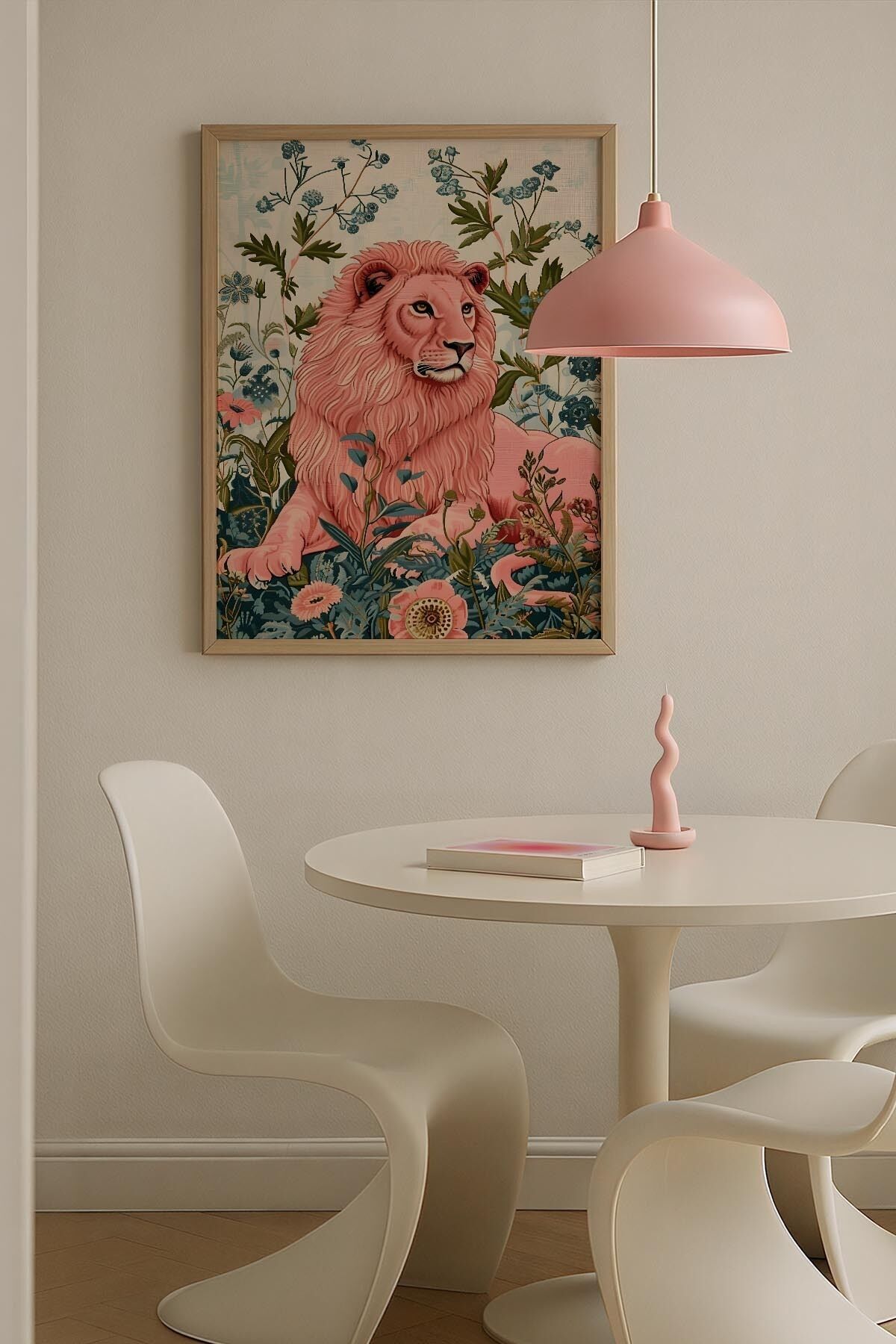 DOĞAL AHŞAP - Çiçekler Arasında Köpek Pembe Maksimalist Sanatı Ahşap Çerçeveli Duvar Tablosu