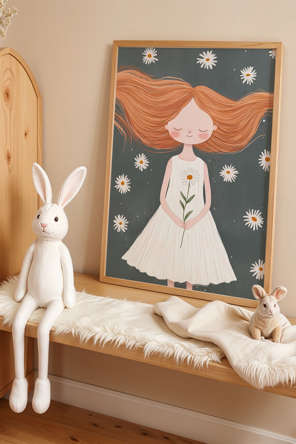 DOĞAL AHŞAP - Çiçekler İçinde Hayalperest Kız - Doğal Ahşap Çerçeveli Çocuk ve Bebek Odası Tablosu