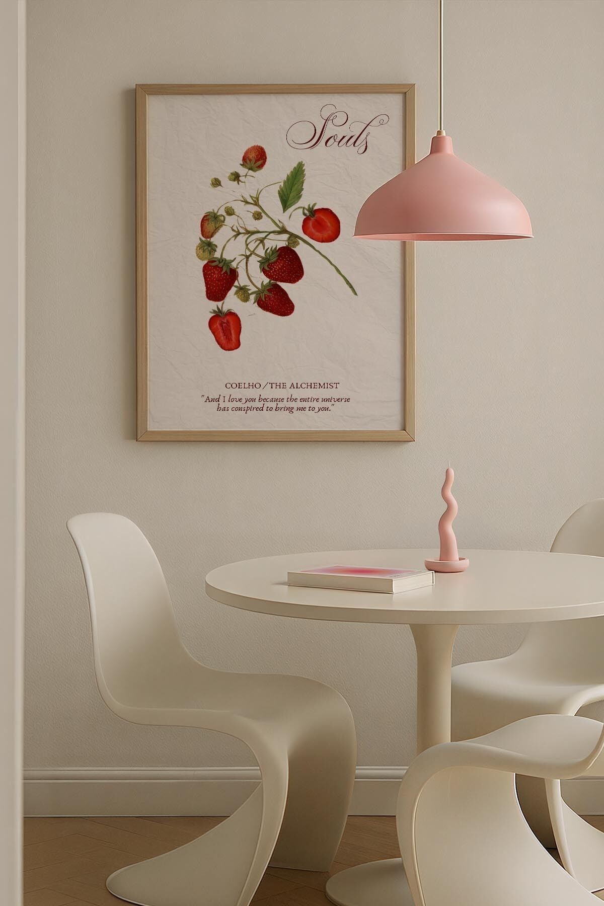 DOĞAL AHŞAP - Çilek İllüstrasyon Botanik Trendy Maksimalist Sanatı Ahşap Çerçeveli Duvar Tablosu
