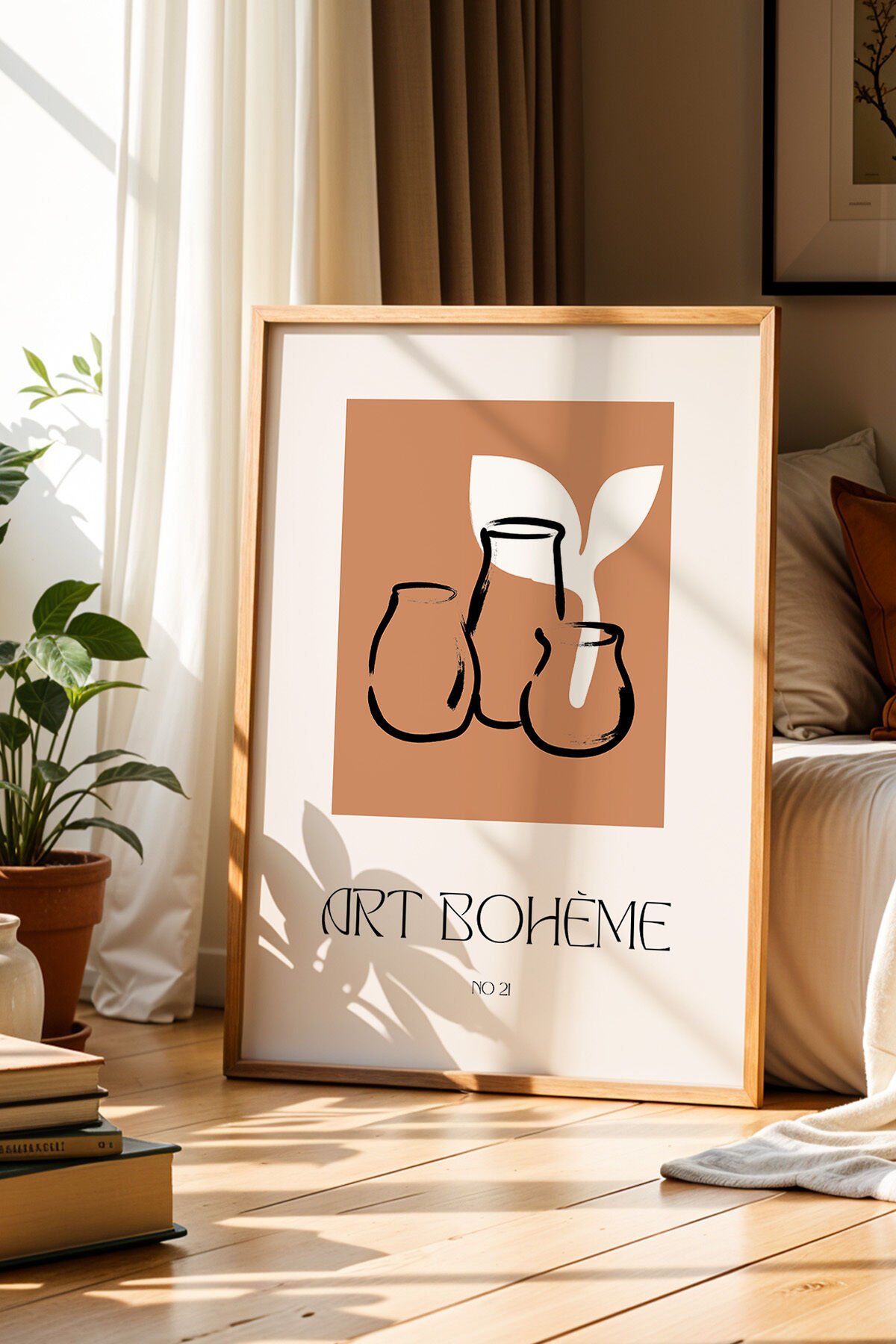 DOĞAL AHŞAP - Dekoratif Saksı Çizimi Bohem Minimalist Kahverengi Doğal Ahşap Çerçeveli Duvar Tablosu