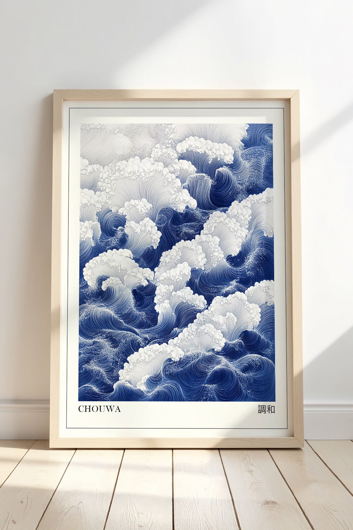 DOĞAL AHŞAP - Derin Mavi Soyut Fırça Dokulu Japon Sanatı Doğal Ahşap Duvar Tablosu